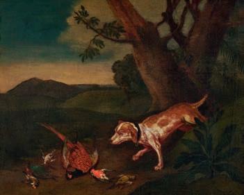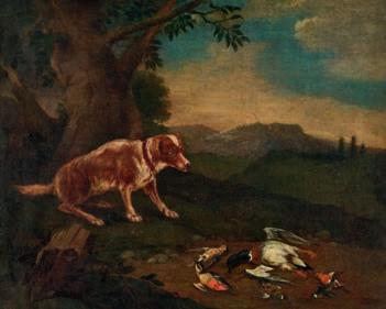 Follower of August Querfurt (1696-1761) Austrian Hunting hound with the day’s catch of game Oil on canvas, together with a companion by the same hand, 33cm by 41.5cm (2)