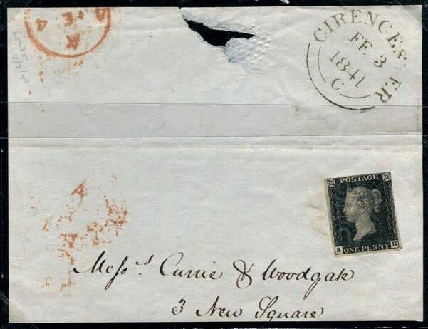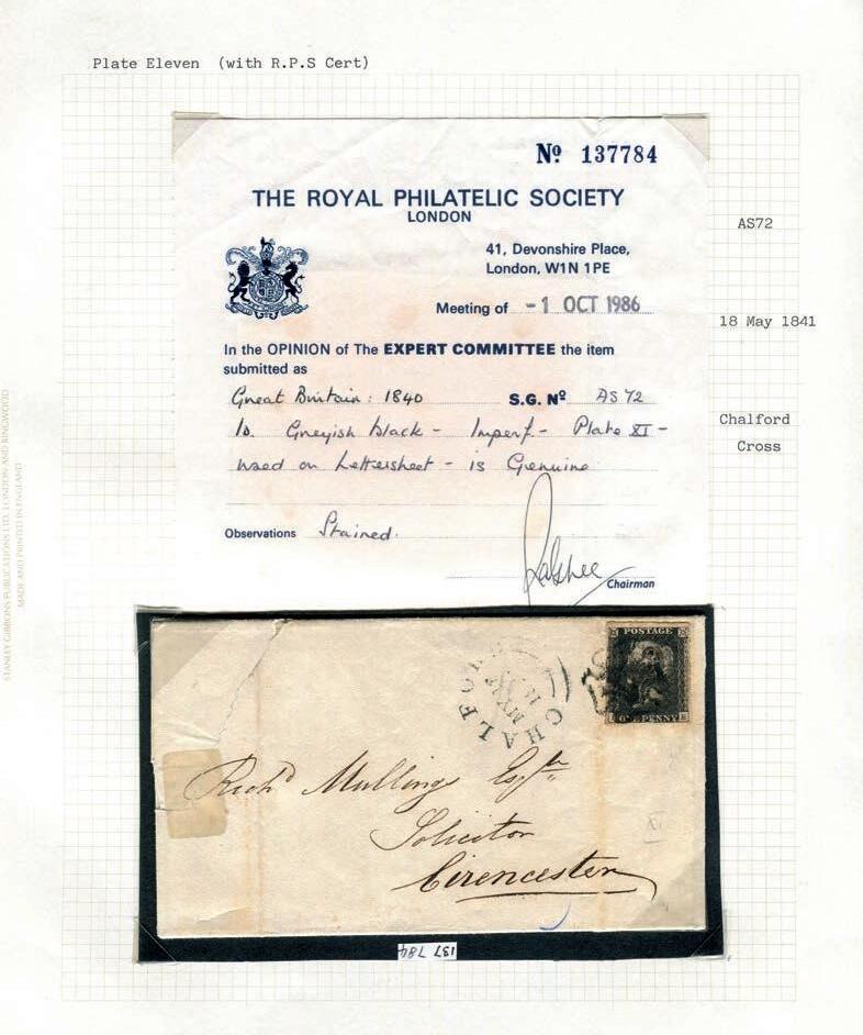 1840 1d black plate 11 (R-E) with four margins (wide at top) tied on May 18th 1841 cover to Cirencester by the usual black Maltese cross, alongside Chalford cds. The stamp with a couple of small disturbances at lower edge and a little yellowed around the edges in general, the cover with tear at left side and small biro strike at bottom, still a relatively clean example of this elusive plate on cover. With 1984 RPS cert. Cat. £16,000.