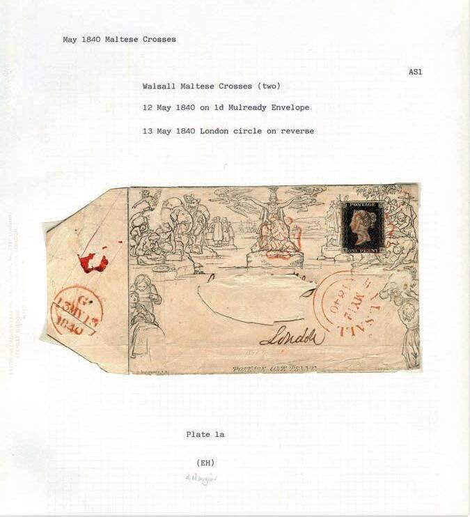 Penny black (plate 1b) tied on London local cover (13 Nov. 1840) by perfect strike of the black Maltese cross during the experimental period of use, with Chancery Lane receiving house pmk in green alongside, the stamp with four very nice margins. Two further receiving house usages with plate 1a (minimum three margins) on cover and plate 2 (four margins) on front tied by another experimental black MX (6 Oct. 1840).