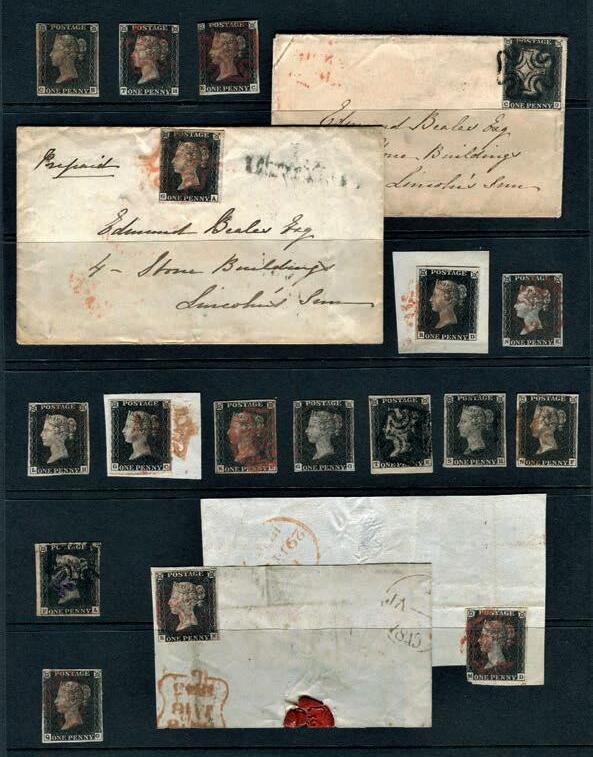 Postal history balance of over 30 stampless items and over 60 line-engraved frankings, with five penny blacks (1 cover and 4 large pieces/fronts) incl. four margins grey-black (plate 1a) on part-cover with 23 or 28 May 1840 arrival mark of Irvine; six 1840 2d blue covers of which three are four-margin stamps, also a front bearing four-margin 1840 2d with multiple strikes of black MX. Then imperf 1d reds starting with two intriguing 1841 covers with stamps bearing red and black cancels, both with 1987 RPS certs, one stating ‘Black and Red M/cross obliterations - committee not prepared to certify Red’ and the second a plate 11 ‘with Black M/cross and Red obliteration - genuine’. Also twelve numbers-in-cross covers in mixed condition, Norwich distinctive crosses to same address, etc.