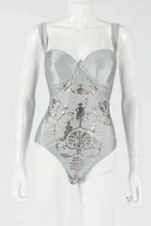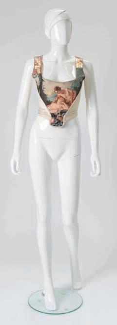 A silk and mesh corset top, printed with a design taken from Francois Boucher’s ‘Daphnis and Chloé Shepherd Watching a Sleeping Shepherdess’ 1743-5, with a zip fastening, straps depicting a picture frame