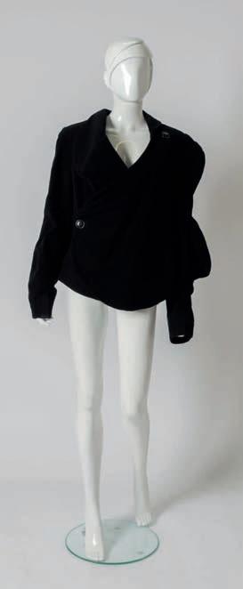 The tailored jacket has a wide collar, lapels with a draped detail beneath, three buttons fastening to the left side