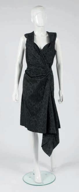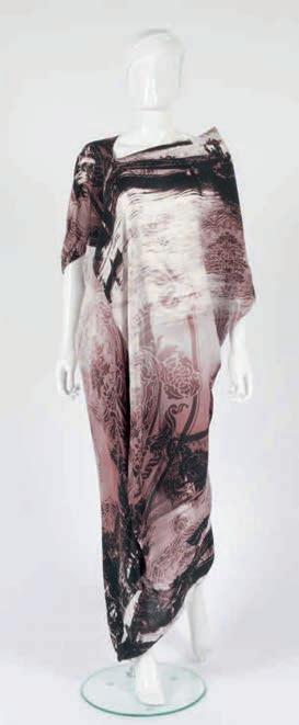 This dress was inspired by a Rococo marquetry mirror dated circa 1713, designed by Andre-Charles Boulle, it boasts intricate twists of acanthus leaves, cupids, satyrs and other motifs in both silver and gold foil on a synthetic velvet.