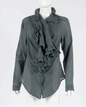 A tailored top woven with the words ‘Gold Label’ in capitals, a wide neckline with a draped bodice, pleats to the shoulders of the long sleeves, straight hem and side vents