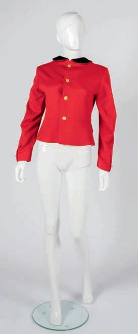 Tailored jacket inspired by guardsmen uniforms in red wool, with long sleeves, shaped collar with black velvet mounts, peplum waist, two-button fastening