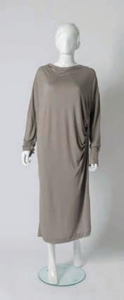 With loose roll neck, cream jersey dress with exaggerated long sleeves, mounted to the side seams and upper sleeves with a brown slubbed fabric forming the sack back to the reverse Worlds End label in teal blue printed on white