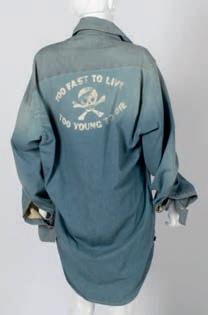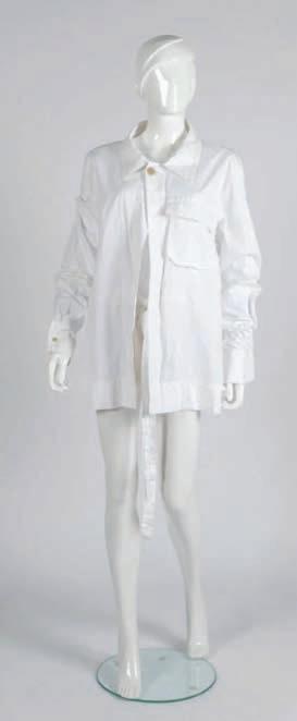 A white cotton T-shirt, printed overall to the front and long sleeves with her red ‘squiggle’ design, the reverse printed with small green triangles and dots, a design seen throughout her collections inspired by heraldry designs, oval shaped blue pin-stripe shirt godets to the sleeves Vivienne Westwood label woven in yellow on red £250-350