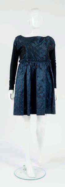 A long sleeved wool dress with scooped neckline, the sleeves and front of dress have gathered strings to adjust the look