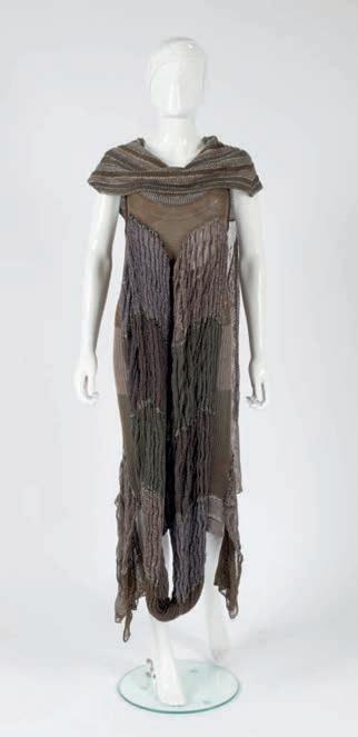 A silver lycra sleeveless dress with wide draped neck, fitted style, woven overall with naked figures