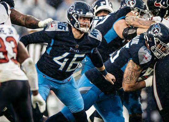¾ Increase the Titans' current winning streak to four games. ¾ Give the Titans a five-game winning streak against the Colts. ¾ Give the franchise its 200th win in the regular season during the team's "Titans era" (1999–present). ¾ Improve the Titans' record after the bye week to 5-0 under head coach Mike Vrabel. ¾ Mark the third consecutive season the Titans have been 4-2 or better after six games. They began the season 5-1 in 2020 and 4-2 in 2021. ¾ Improve Mike Vrabel’s career record to 47-29 as a head coach, including regular season and playoffs. He has the thirdhighest win total in franchise history behind only Jeff Fisher (147) and Bum Phillips (59). ¾ Improve QB Ryan Tannehill’s combined starting record in the regular season and playoffs to 78-64, including a 36-18 record with the Titans. ¾ Improve the Titans’ all-time record at Nissan Stadium to 11083, including the regular season and playoffs.