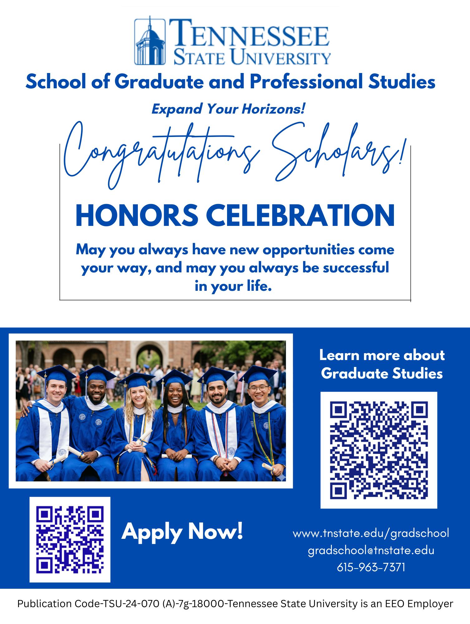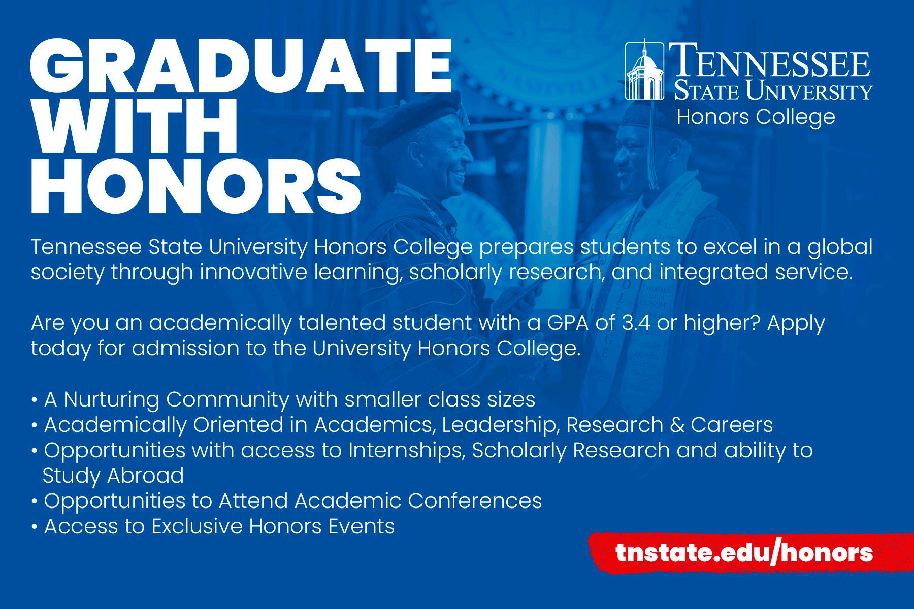 It was the desire of former President Glenda Glover and the administrators to implement the goal of the Academic Master Plan 2008-2028 that enhanced the Honors Program and transitioned it into an Honors College. Dr. Jackson took the lead in the application process, and in January 2016, the Tennessee Board of Regents and the Tennessee Higher Education Committee approved the Honors Program to be elevated from an Honors Program to an Honors College. The Honors College currently consists of over 704 multi-disciplinary, high-achieving scholars who must maintain an overall GPA of 3.25 or above. The Honors College boasts world-class faculty, who are nurturing yet have high expectations of their students, who are challenged with rigorous course work. Students who love to be challenged academically tend to excel in their studies, enjoy community service to make a difference in the lives of others, conduct scholarly research, and engage in professional and career development. They relish the warm and engaging, tight-knit, family-type community that the Honors College provides. As a result, our assessment shows that Honors College has a 93.99% Fall to Fall retention rate and graduates all of its seniors, with approximately 83% earning their University Honors distinction. Today, we are pleased to salute the Honors graduates who have excelled in their academics, many of whom have already landed high-level positions with top companies and been accepted into medical schools, law schools, pharmacy schools, graduate programs, and other professional schools.