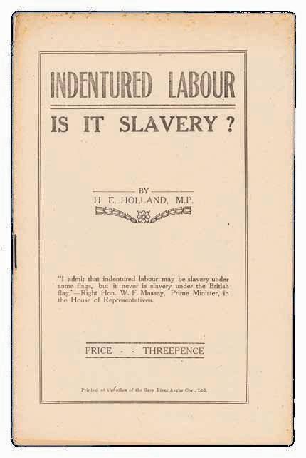 In his pamphlet Indentured Labour: Is it slavery?, published in 1920, New Zealand MP Harry Holland drew on a range of contemporary sources to highlight the