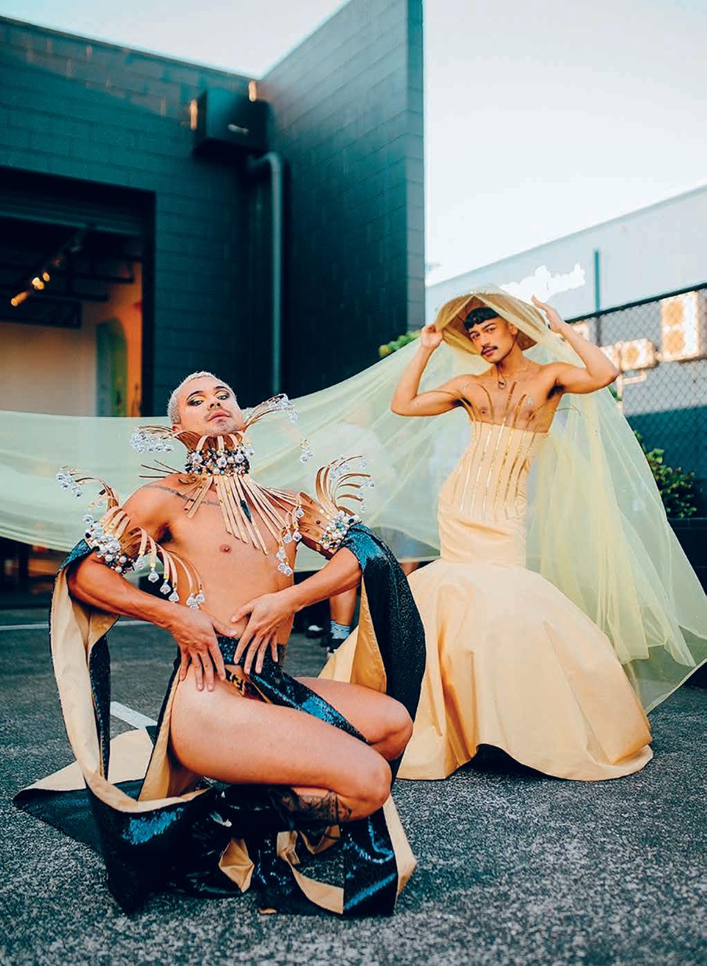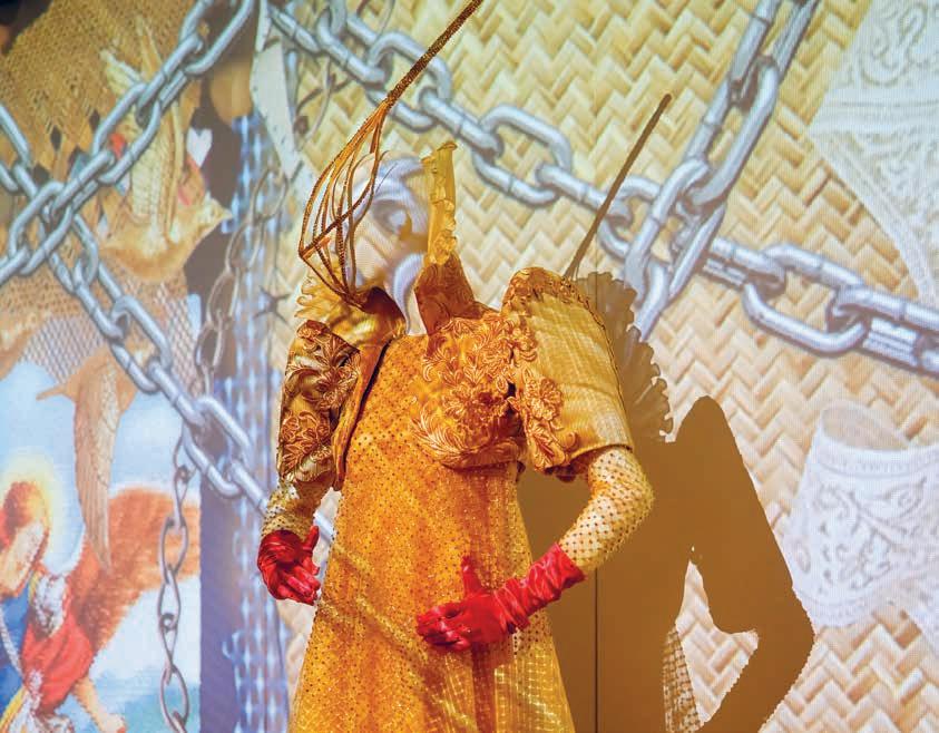 Ang Sininang Bulawan (The Golden Dress), which was exhibited at Studio One Toi Tū in Tāmaki Makaurau in early 2025. Dennis’s dress was inspired by the fabulous regalia created by queer folk for religious status inside churches and conceived as an outfit that ‘could be worn by both the Virgin Mary and a drag performer’. 5