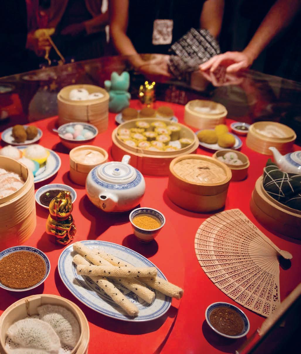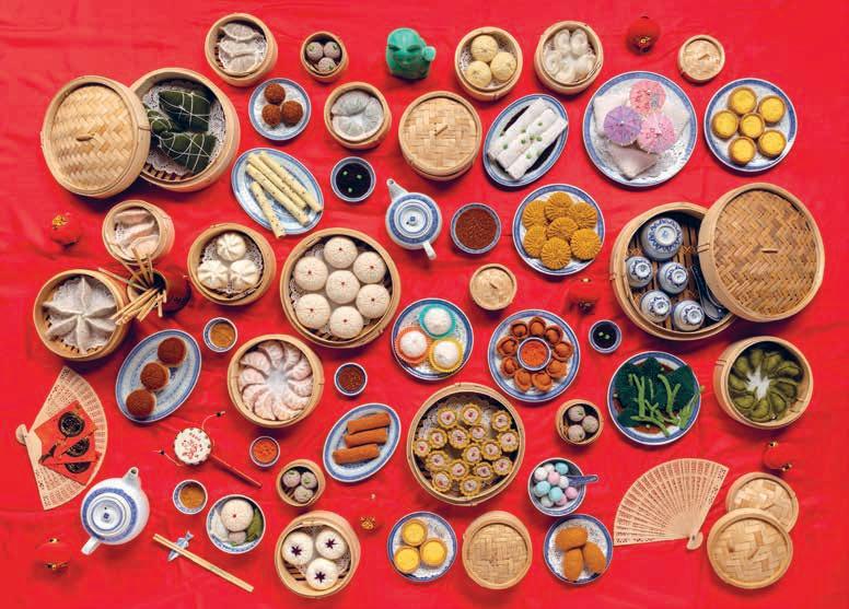 knitted replicas of yum cha delicacies her mother and grandmother used to prepare. Through this labour-intensive process, she renders visible the significant amount of work that both women performed in their daily lives. Moon’s mother and grandmother before her were also talented knitters, and Moon’s skill in creating the many complex elements of this work can also be read as a homage to the intergenerational knowledge they passed down to her.
