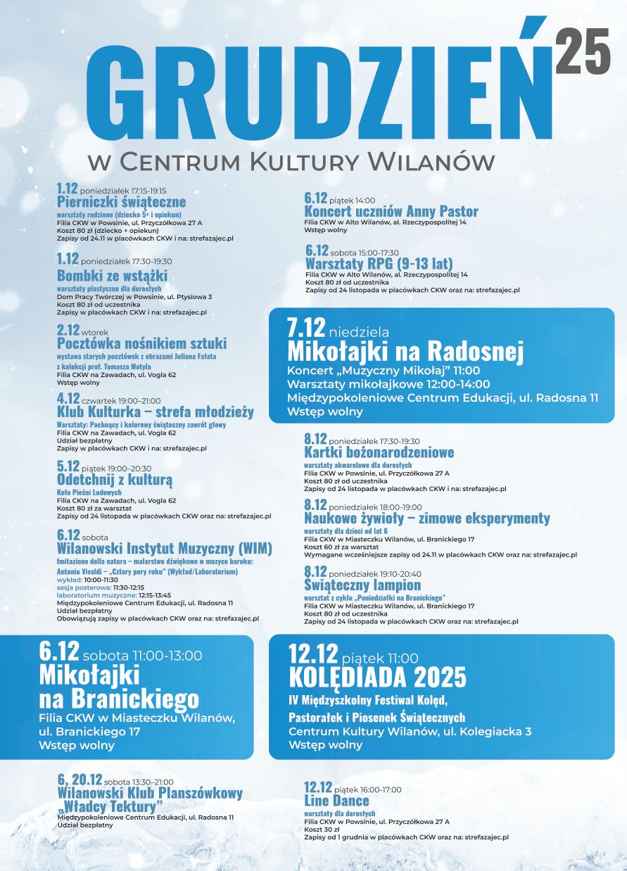 W tym numerze zachęcamy do odkrywania zimowego Wilanowa na nowo — pełnego wydarzeń, aktywności i wyjątkowych miejsc. Szczególnie polecamy zimowy program Centrum Kultury Wilanów, które niedawno obchodziło swoje 25-lecie. To właśnie tam od lat tworzy się przestrzeń dialogu, inspiracji i międzypokoleniowej integracji.