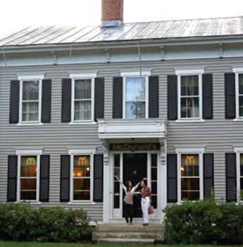 • McDonald’s w zabytkowej willi w Freeport (USA) zrezygnował z charakterystycznych żółtych łuków, by zachować spójność z otoczeniem.
