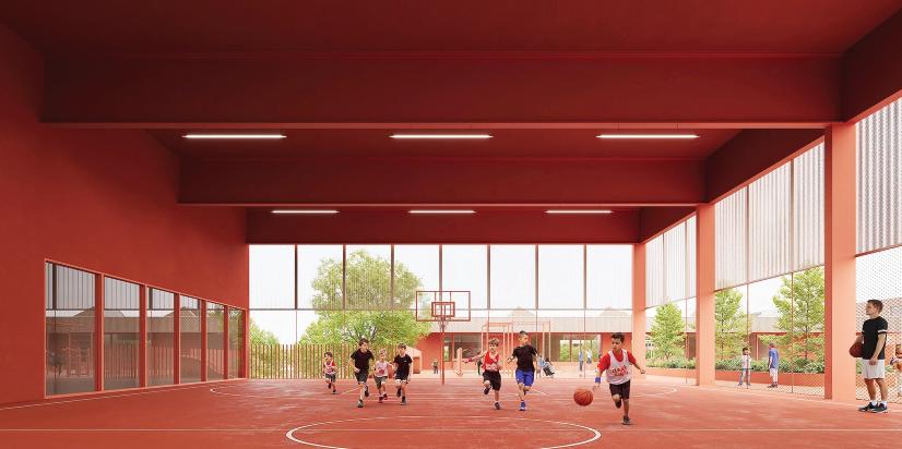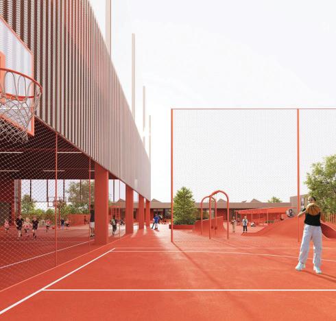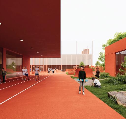 Przeniesienie tych funkcji na dach pozwoliło uwolnić cenną powierzchnię biologicznie czynną na poziomie gruntu i wykreowało znak rozpoznawczy szkoły. Wystająca poza obrys budynku bieżnia tworzy charakterystyczne zadaszenia i dynamiczny element architektoniczny. Co ważne, „dek” będzie dostępny również po godzinach pracy szkoły, jako przestrzeń otwarta dla mieszkańców.