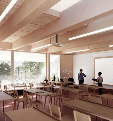 • zastosowanie drewna klejonego BSH i CLT w konstrukcji szkoły i części terapeutycznej.