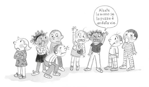 “Non lo so”, risponde lei, poi si sventola una mano davanti alla faccia e fa un’espressione schifata. Rosabella si tappa il naso, allora lo faccio anch’io. Quindi si tappano tutti il naso.