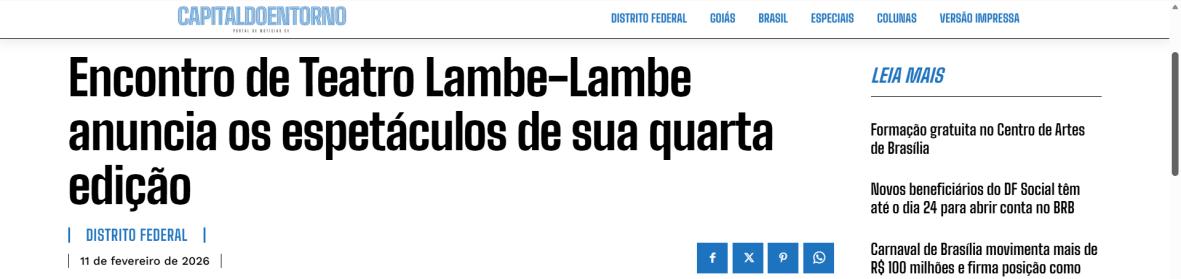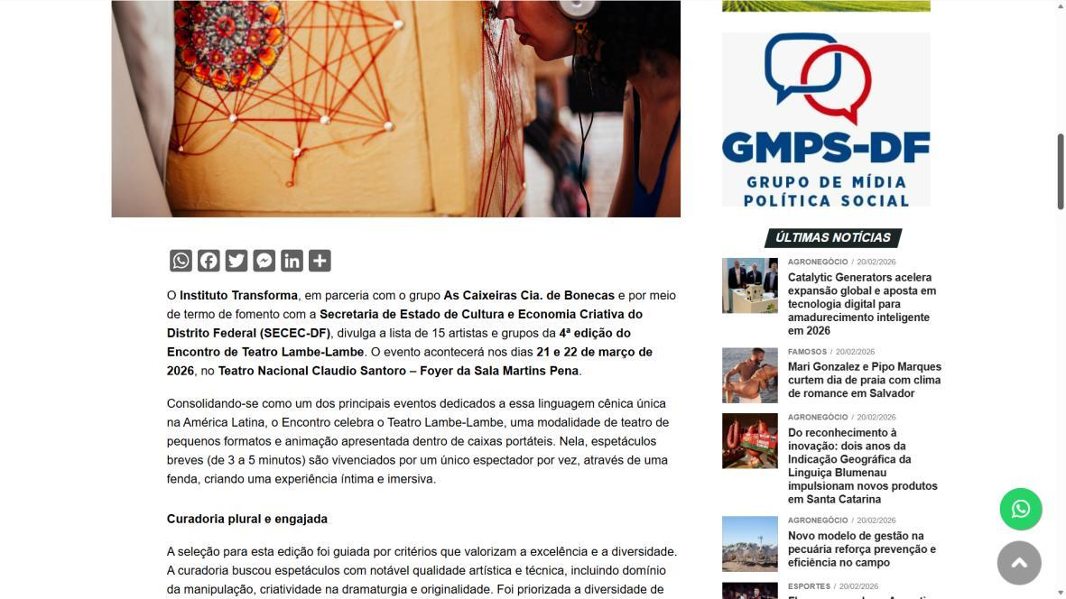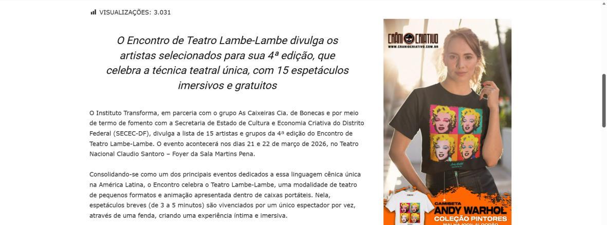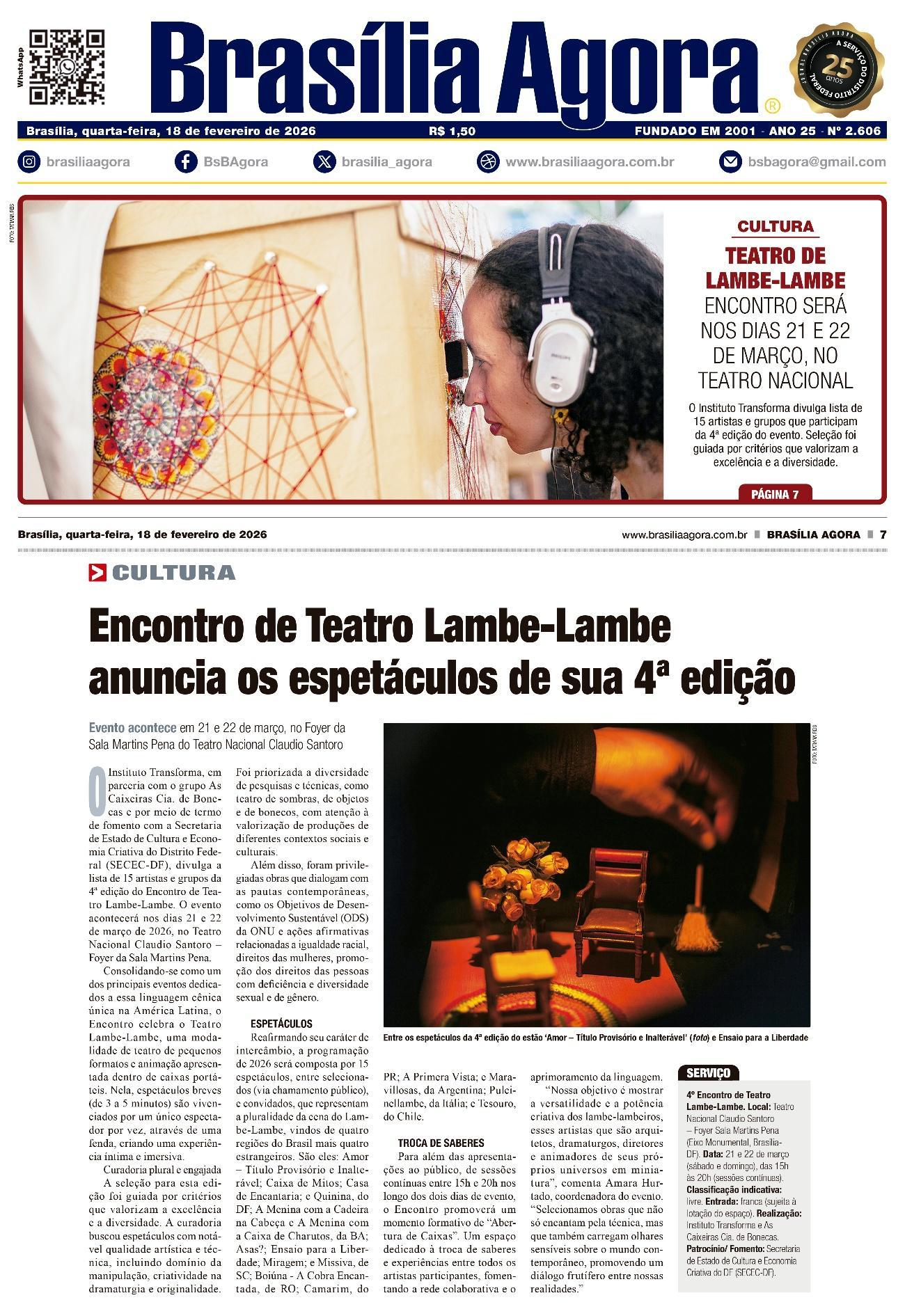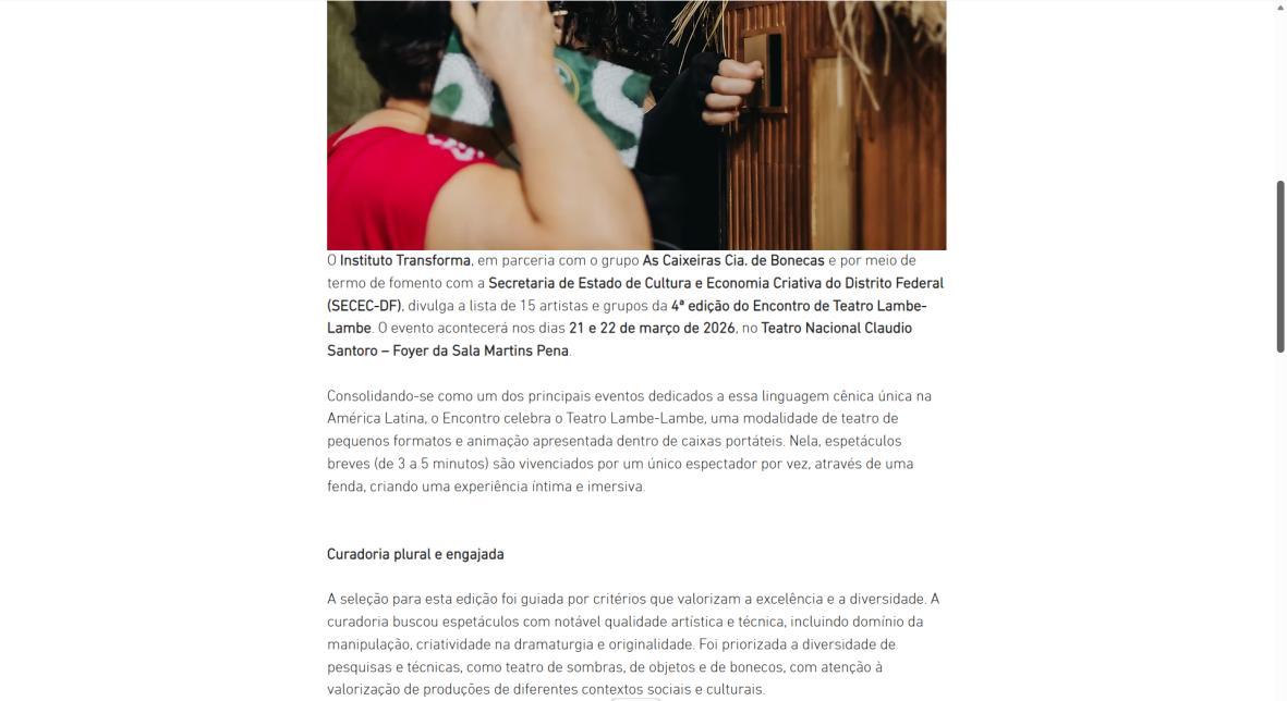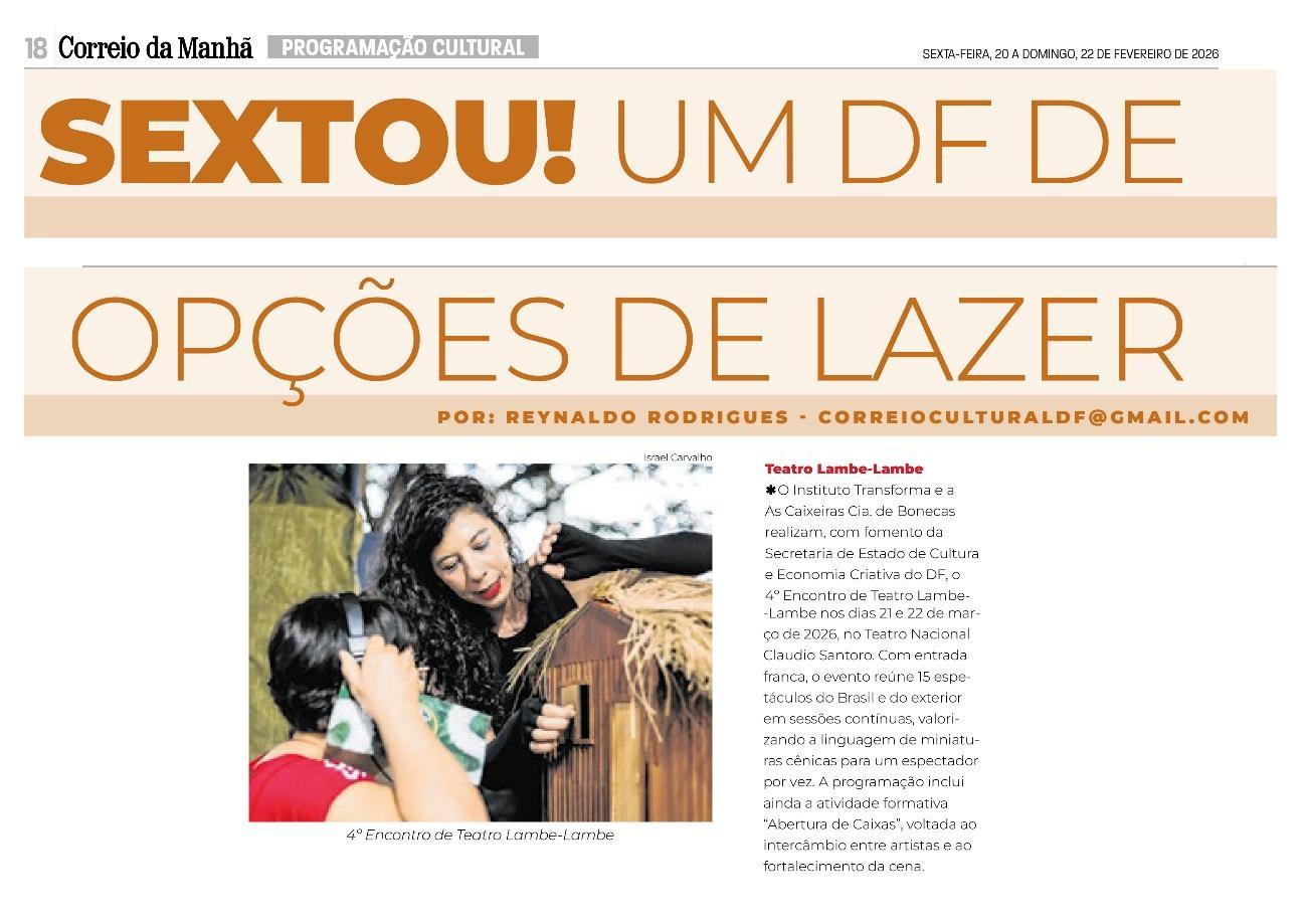 O Instituto Transforma, em parceria com o grupo As Caixeiras Cia. de Bonecas e por meio de termo de fomento com a Secretaria de Estado de Cultura e Economia Criativa do Distrito Federal (SECEC-DF), divulga a lista de 15 artistas e grupos da 4ª edição do Encontro de Teatro Lambe-Lambe. O evento acontecerá nos dias 21 e 22 de março de 2026, no Teatro Nacional Claudio Santoro – Foyer da Sala Martins Pena