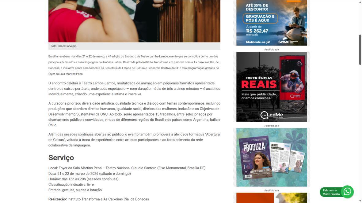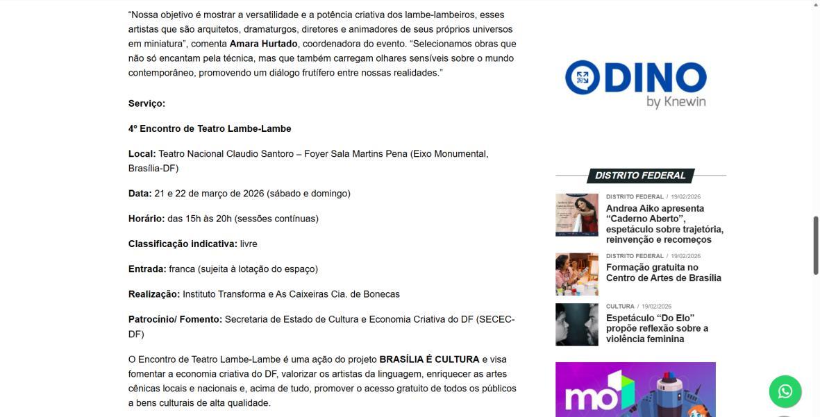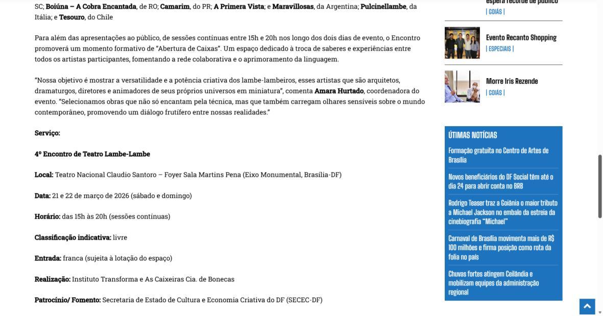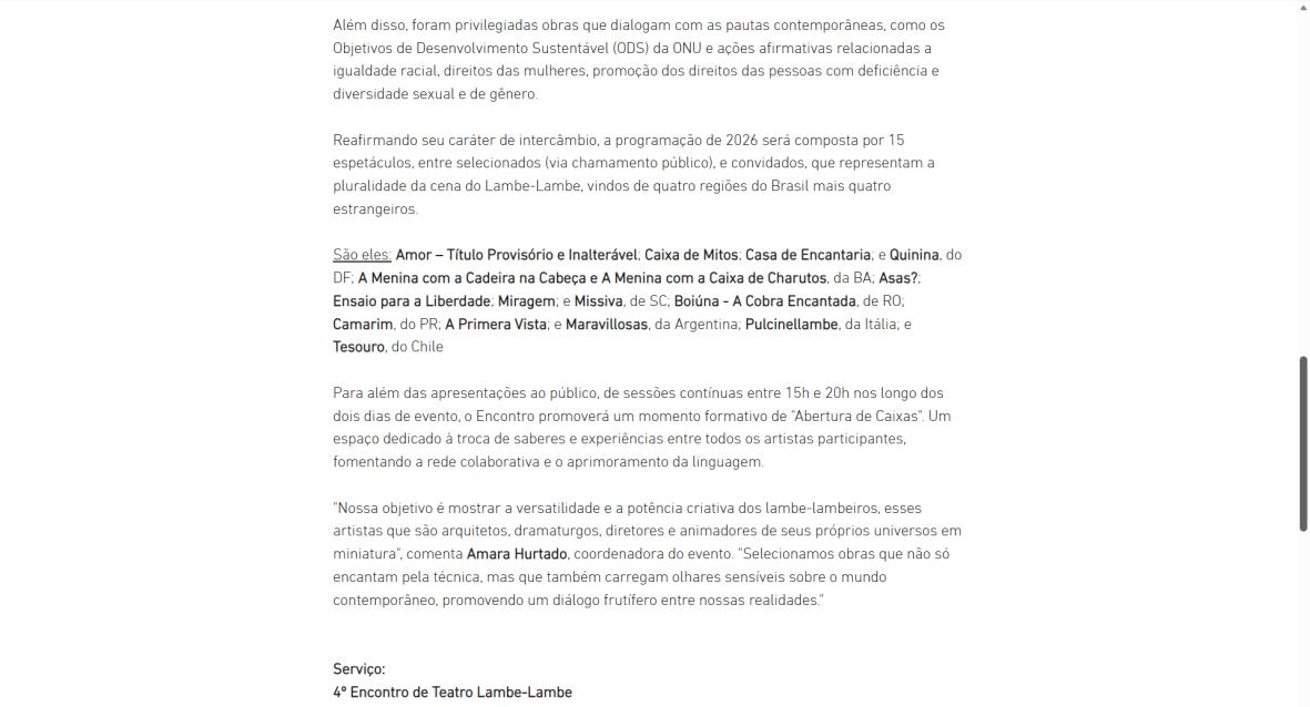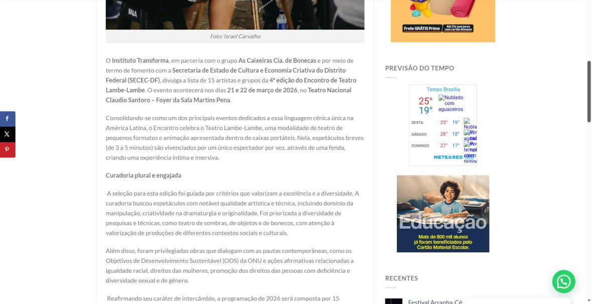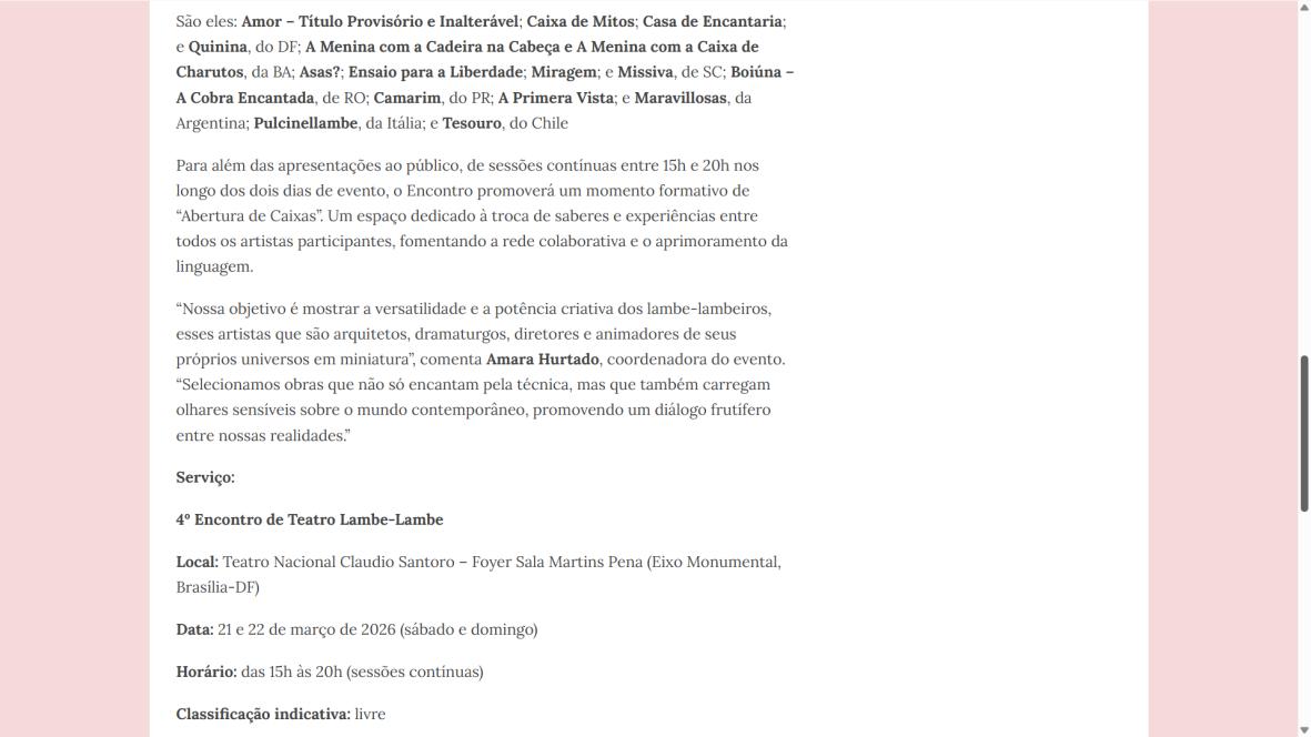 O Instituto Transforma, em parceria com o grupo As Caixeiras Cia. de Bonecas e por meio de termo de fomento com a Secretaria de Estado de Cultura e Economia Criativa do Distrito Federal (SECEC-DF), divulga a lista de 15 artistas e grupos da 4ª edição do Encontro de Teatro Lambe-Lambe. O evento acontecerá nos dias 21 e 22 de março de 2026, no Teatro Nacional Claudio Santoro – Foyer da Sala Martins Pena