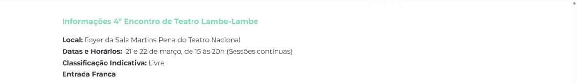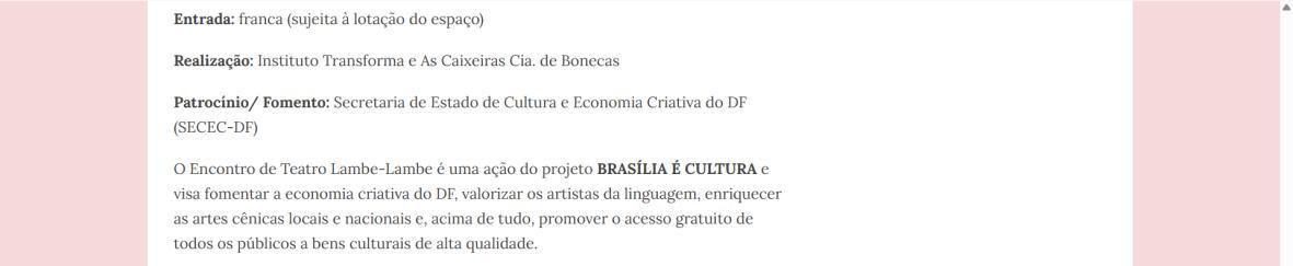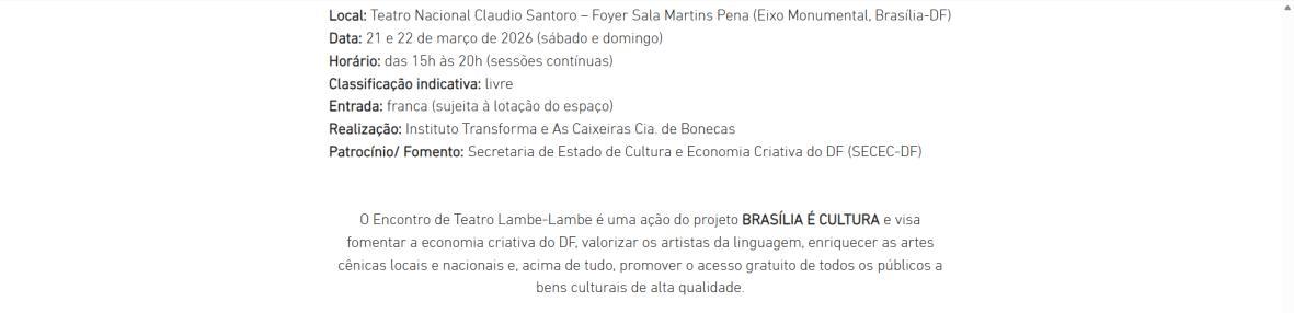 O Encontro de Teatro Lambe-Lambe é uma ação do projeto BRASÍLIA É CULTURA e visa fomentar a economia criativa do DF, valorizar os artistas da linguagem, enriquecer as artes cênicas locais e nacionais e, acima de tudo, promover o acesso gratuito de todos os públicos a bens culturais de alta qualidade.