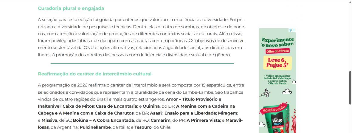 Reafirmando seu caráter de intercâmbio, a programação de 2026 será composta por 15 espetáculos, entre selecionados (via chamamento público), e convidados, que representam a pluralidade da cena do Lambe-Lambe, vindos de quatro regiões do Brasil mais quatro estrangeiros.