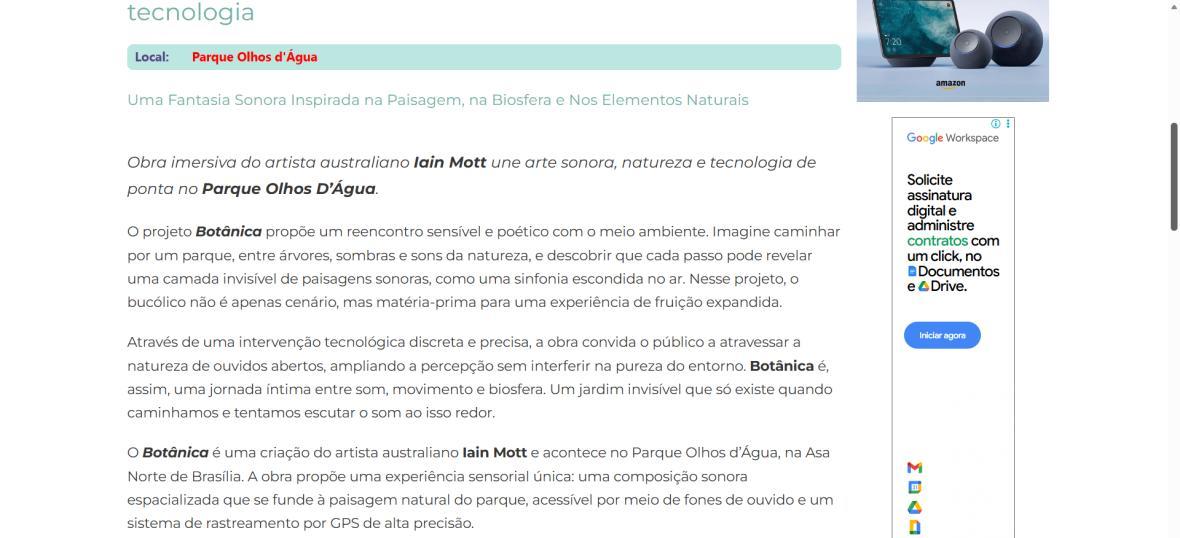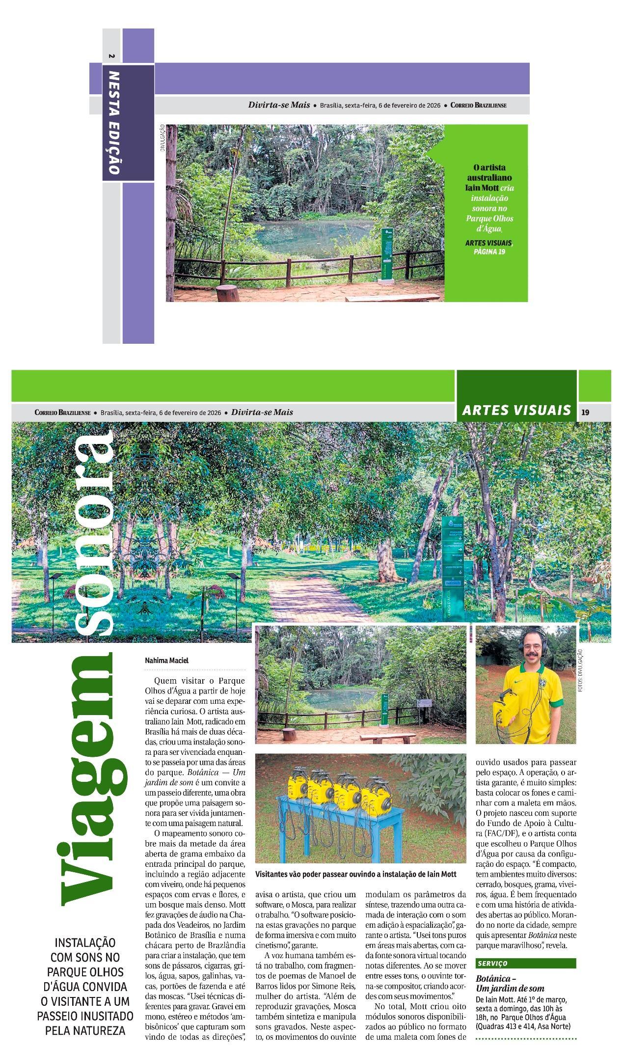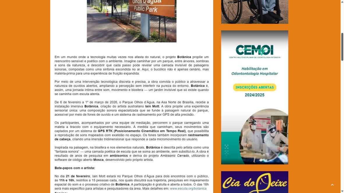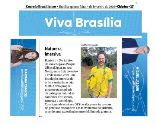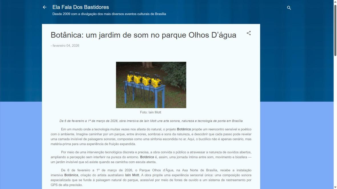 De 6 de fevereiro a 1º de março de 2026, o Parque Olhos d’Água, na Asa Norte de Brasília, recebe a instalação imersiva Botânica, criação do artista australiano Iain Mott. A obra propõe uma experiência sensorial única: uma composição sonora espacializada que se funde à paisagem natural do parque, acessível por meio de fones de ouvido e um sistema de rastreamento por GPS de alta precisão.
