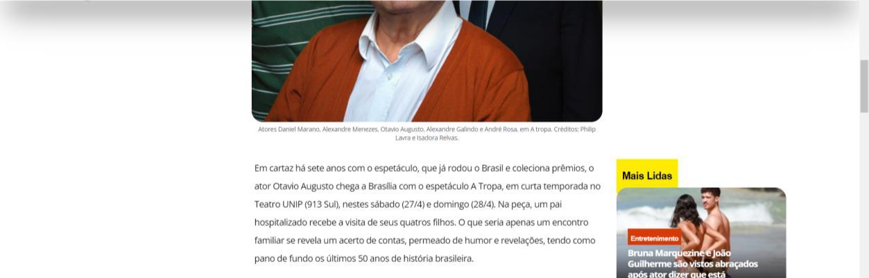 Em cartaz há sete anos com o espetáculo, que já rodou o Brasil e coleciona prêmios, o ator Otávio Augusto chega a Brasília com a peça A Tropa em curta temporada no Teatro UNIP (913 Sul), 27 e 28 de abril Na peça, um pai hospitalizado recebe a visita de seus quatros filhos. O que seria apenas um encontro familiar se revela um acerto de contas, permeado de humor e revelações, tendo como pano de fundo os últimos 50 anos de história brasileira.