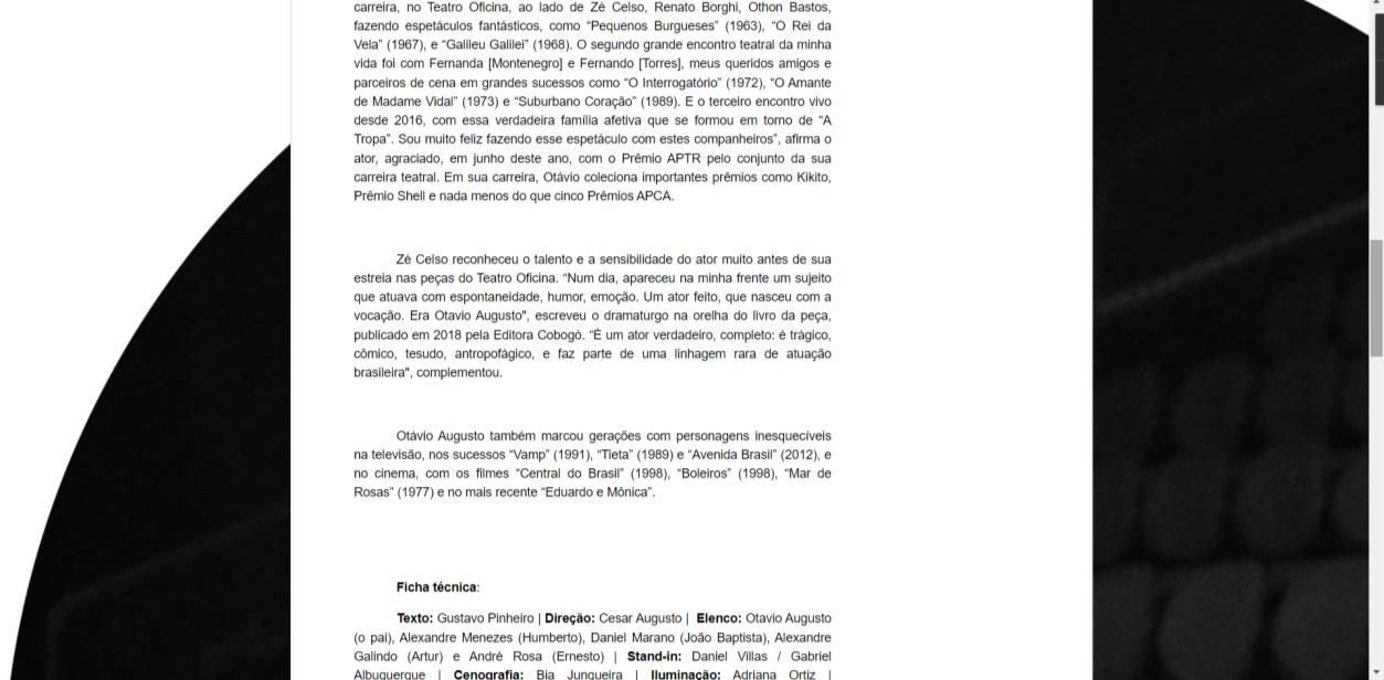 “Tenho três famílias teatrais fundamentais: a primeira foi no começo da minha carreira, no Teatro Oficina, ao lado de Zé Celso, Renato Borghi, Othon Bastos, fazendo espetáculos fantásticos, como “Pequenos Burgueses” (1963), “O Rei da Vela” (1967), e “Galileu Galilei” (1968). O segundo grande encontro teatral da minha vida foi com Fernanda [Montenegro] e Fernando [Torres], meus queridos amigos e parceiros de cena em grandes sucessos como “O Interrogatório” (1972), “O Amante de Madame Vidal” (1973) e “Suburbano Coração” (1989). E o terceiro encontro vivo desde 2016, com essa verdadeira família afetiva que se formou em torno de “A Tropa”. Sou muito feliz fazendo esse espetáculo com estes companheiros”, afirma o ator, agraciado, em junho deste ano, com o Prêmio APTR pelo conjunto da sua carreira teatral. Em sua carreira, Otavio coleciona importantes prêmios como Kikito, Prêmio Shell e nada menos do que cinco Prêmios APCA.