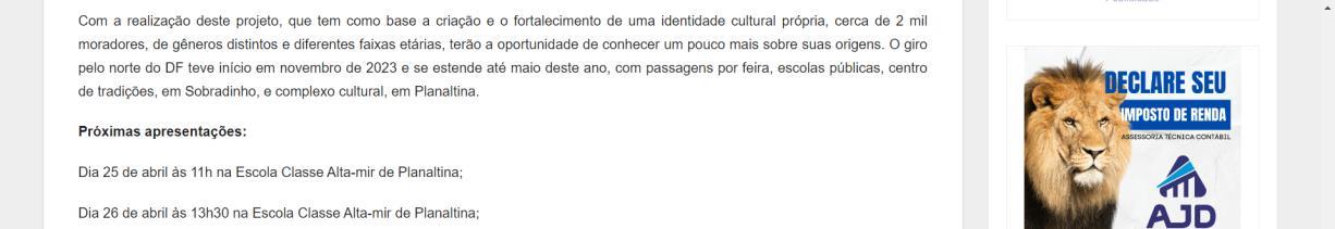 Com a realização deste projeto, que tem como base a criação e o fortalecimento de uma identidade cultural própria, cerca de 2 mil moradores, de gêneros distintos e diferentes faixas etárias, terão a oportunidade de conhecer um pouco mais sobre suas origens. O giro pelo norte do DF teve início em novembro de 2023 e se estende até maio deste ano, com passagens por feira, escolas públicas, centro de tradições, em Sobradinho, e complexo cultural, em Planaltina.