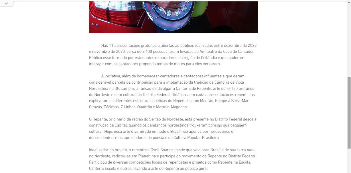 Nas 11 apresentações gratuitas e abertas ao público, realizadas entre dezembro de 2022 e novembro de 2023, cerca de 2.400 pessoas foram levadas ao Anfiteatro da Casa do Cantador. Público esse formado por estudantes e moradores da região de Ceilândia e que puderam interagir com os cantadores propondo temas de motes para eles versarem
