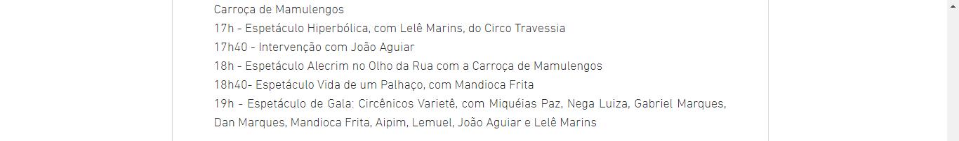 19h Espetáculo de Gala: Circênicos Varietê, com Miquéias Paz, Nega Luiza, Gabriel Marques, Dan Marques, Mandioca Frita, Aipim, Lemuel, João Aguiar e Lelê Marins