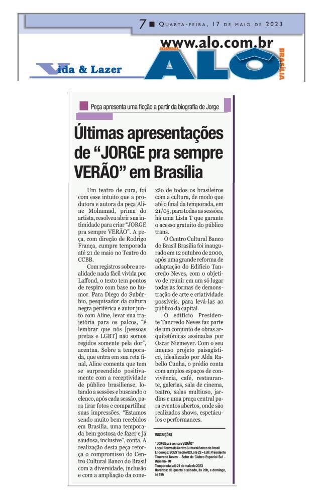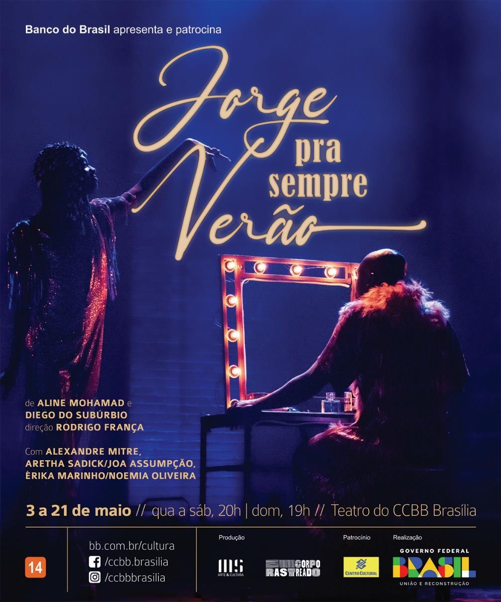 Foi com o intuito de realizar um teatro de cura que a produtora e autora da peça Aline Mohamad resolveu abrir seus arquivos mais íntimos para criar o espetáculo Após temporadas de sucesso no Rio de Janeiro e em São Paulo e passagens por festivais como o Velha Joana, em Primavera do Leste (MS), “JORGE pra sempre VERÃO” chega ao Teatro do CCBB Brasília, onde cumpre temporada de 03 a 21 de maio