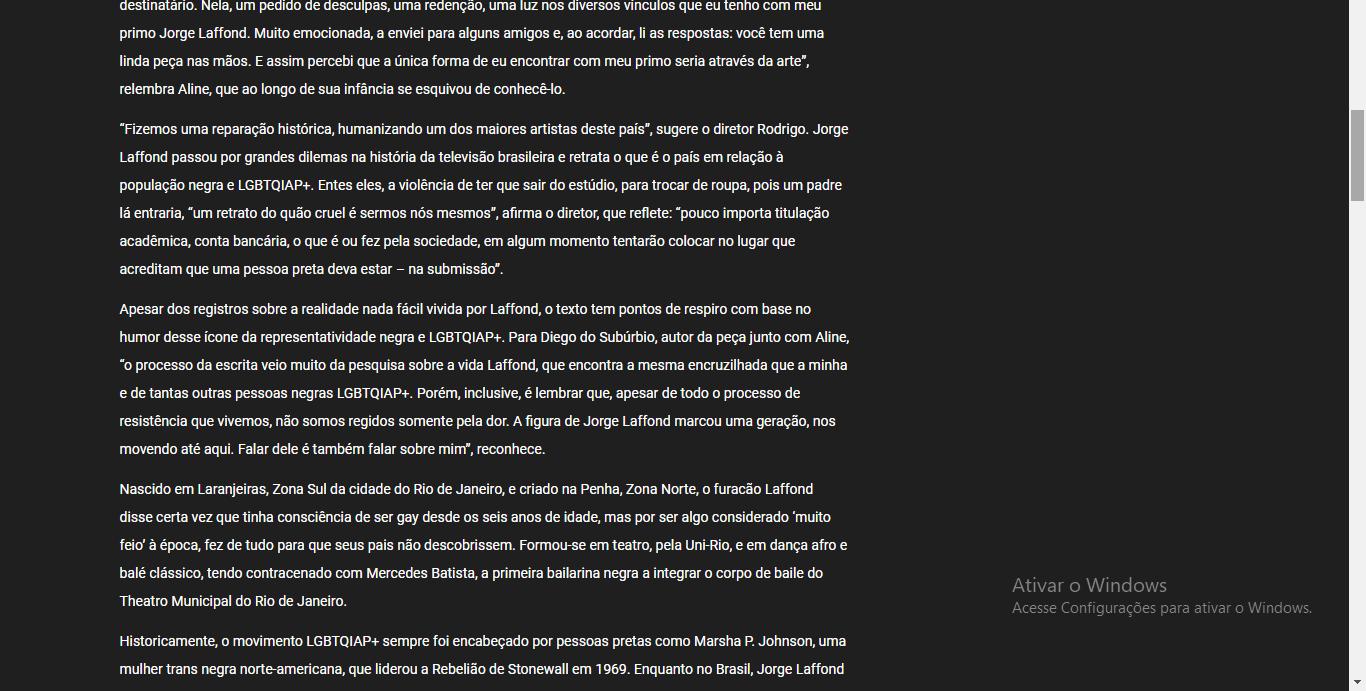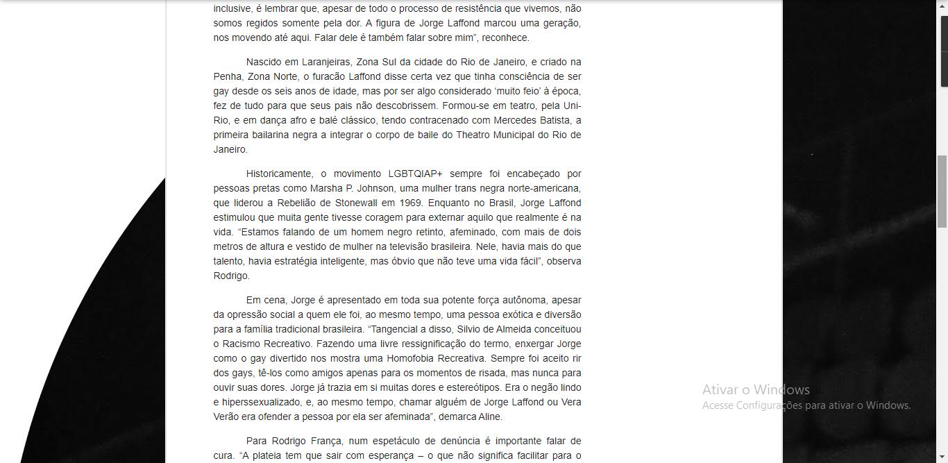 Apesar dos registros sobre a realidade nada fácil vivida por Laffond, o texto tem pontos de respiro com base no humor desse ícone da representatividade negra e LGBTQIAP+ Para Diego do Subúrbio, autor da peça junto com Aline, “o processo da escrita veio muito da pesquisa sobre a vida Laffond, que encontra a mesma encruzilhada que a minha e de tantas outras pessoas negras LGBTQIAP+. Porém, inclusive, é lembrar que, apesar de todo o processo de resistência que vivemos, não somos regidos somente pela dor. A figura de Jorge Laffond marcou uma geração, nos movendo até aqui. Falar dele é também falar sobre mim”, reconhece