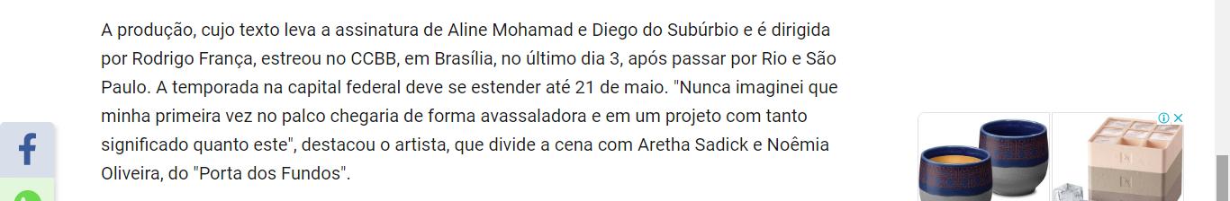 Texto original: Aline Mohamad e Diego do Subúrbio | Direção: Rodrigo França | Assistente de direção: Kennedy Lima | Elenco: Alexandre Mitre, Aretha Sadick e