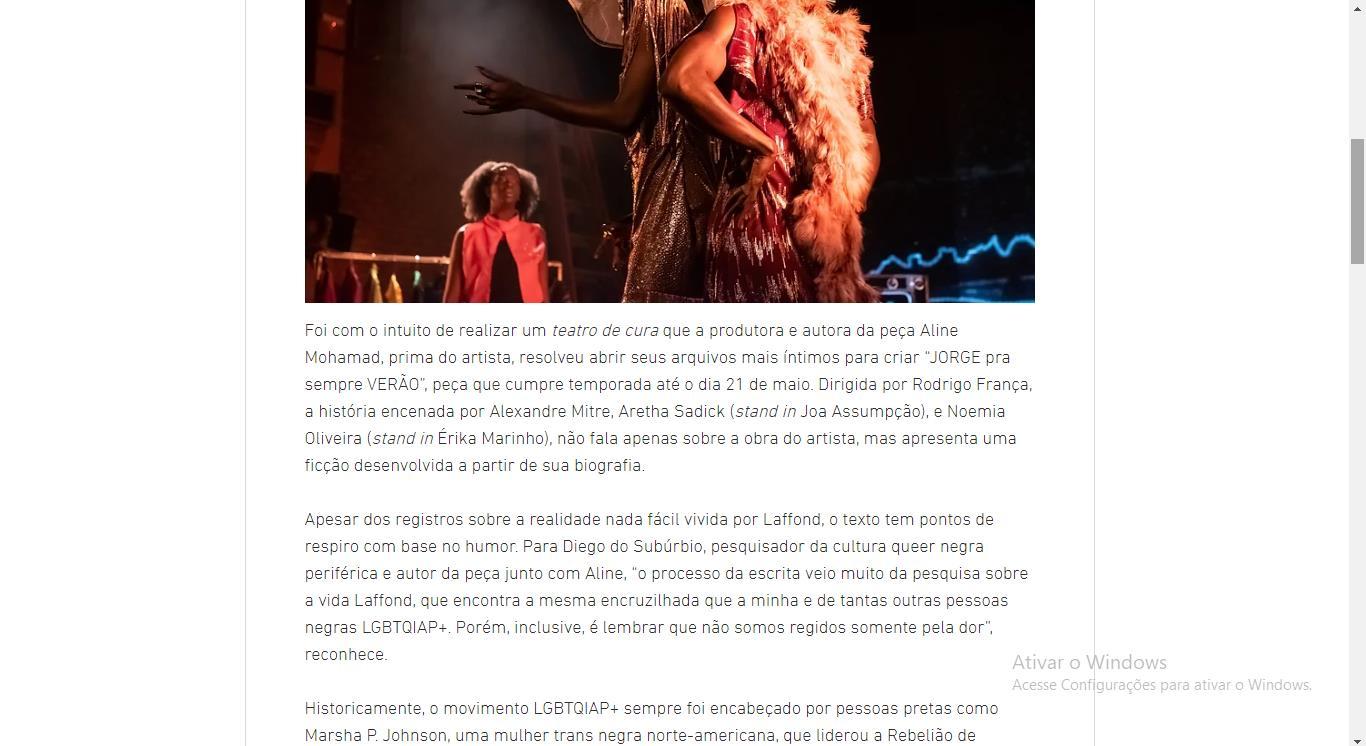 Aline entendeu que era exatamente sobre isso: um teatro de cura. “Não me vejo apenas como a prima, mas como uma pessoa da sociedade. Uma sociedade doente que resolve cortar laços com sua família apenas por vergonha de olhar para as suas feridas. Jorge é uma figura extremamente importante na construção dos nossos corpos. Sua forma livre, verdadeira, mostrou a hipocrisia presente em nossas vidas na forma de alegria divina. Seu jeito sincero, genuíno, real, possibilitou que vários corpos de hoje existissem da maneira que são. A sensação é de cura, de redenção”, finaliza.
