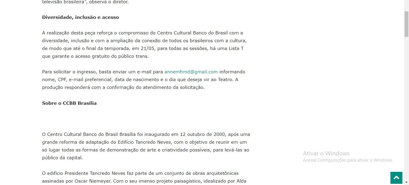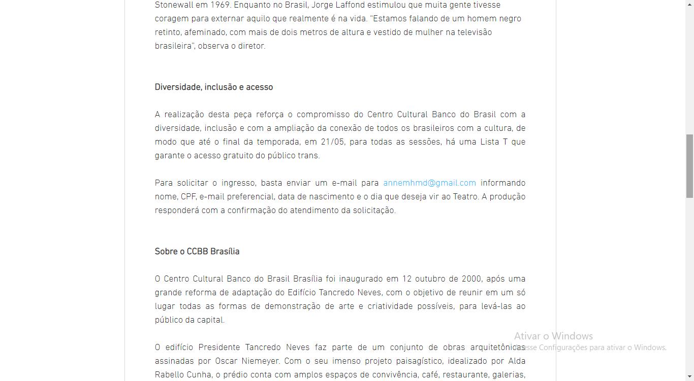 A realização desta peça reforça o compromisso do Centro Cultural Banco do Brasil com a diversidade, inclusão e com a ampliação da conexão de todos os brasileiros com a cultura, de modo que até o final da temporada, em 21/05, para todas as sessões, há uma Lista T que garante o acesso gratuito do público trans.