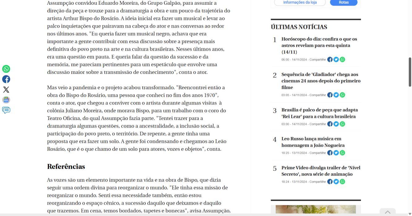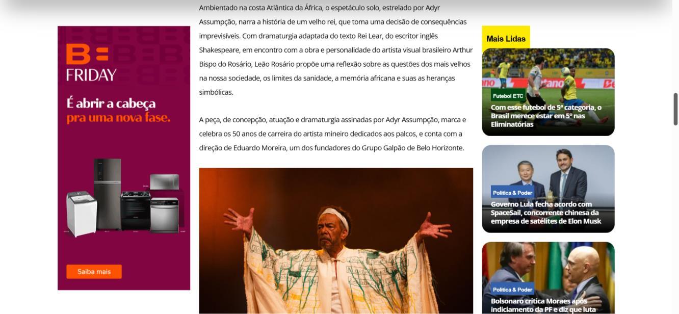 Premiado: Este mês, o espetáculo recebeu o Prêmio Leda Maria Martins 2024 - Cena em Sombras, concedido pela Universidade Federal de Minas Gerais, na Categoria: Conjunto da Obra, por seu cenário, figurino, adereços e iluminação.