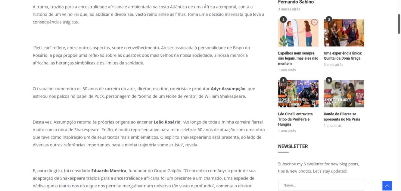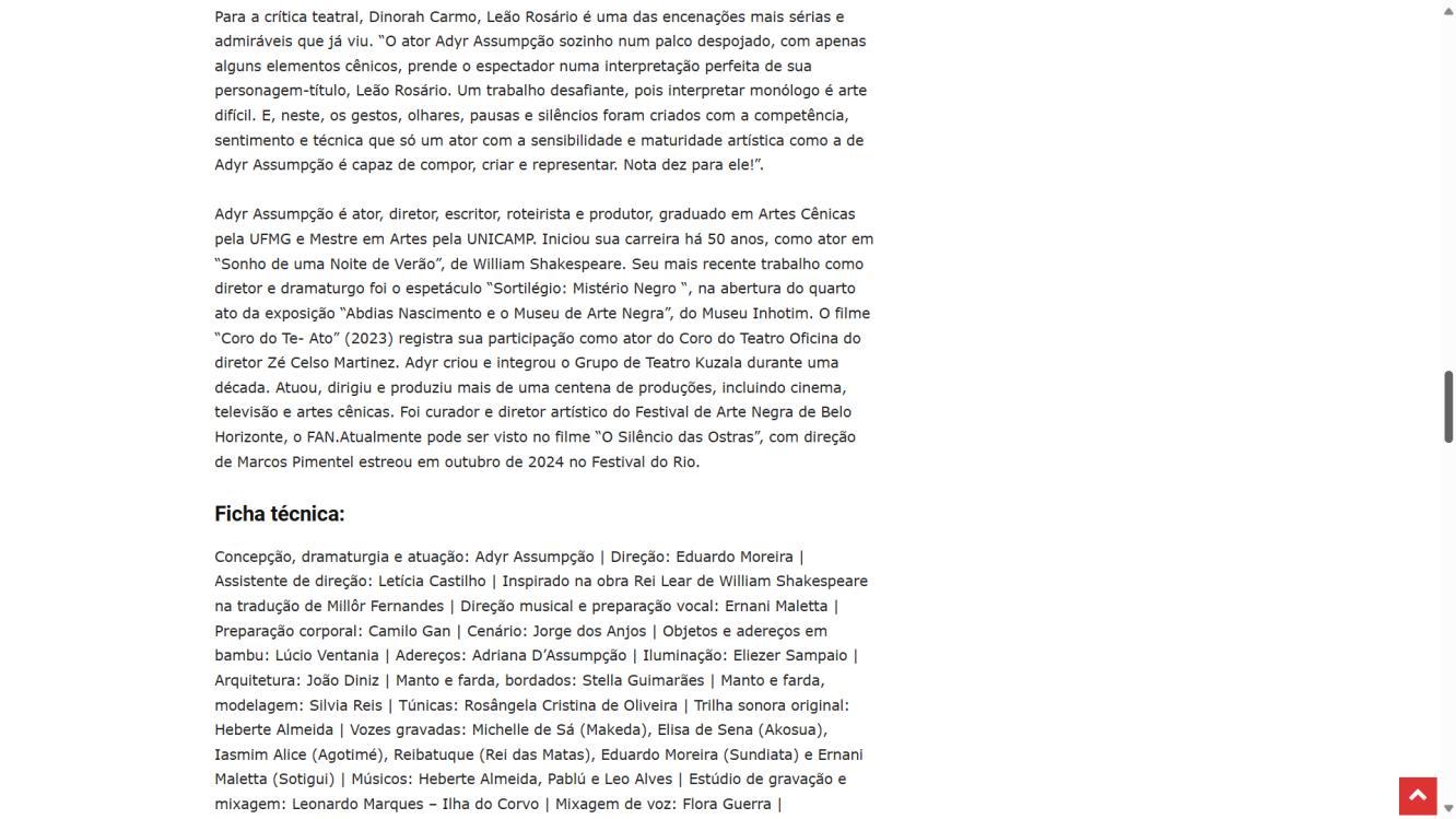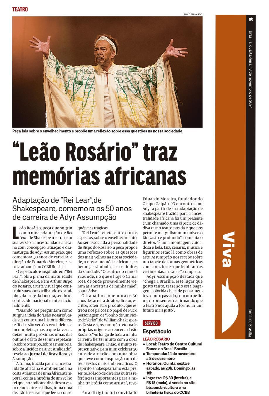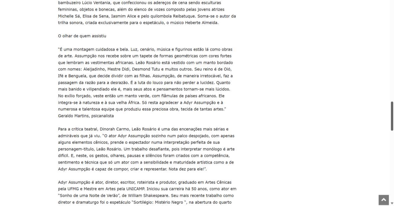 “É uma montagem cuidadosa e bela. Luz, cenário, música e figurinos estão lá como obras de arte. Assumpção nos recebe sobre um tapete de formas geométricas com cores fortes que lembram as vestimentas africanas. Leão Rosário está vestido com um manto bordado com nomes: Aleijadinho, Mestre Didi, Desmond Tutu e muitos outros. Seu reino é de Oió, Ifé e Benguela, que decide dividir com as filhas. Assumpção, de maneira irretocável, faz a passagem da razão para a desrazão. É a luta do louco para não perder a lucidez. Quanto mais banido e vilipendiado ele é, mais seus atos e pensamentos tornam-se mais lúcidos. No exílio forçado, veste então um manto verde, com flâmulas de países africanos. Ele integra-se à natureza e à sua velha África. Só resta agradecer a Adyr Assumpção e à numerosa e talentosa equipe que produziu essa preciosa obra, tecida de tantas artes.” Geraldo Martins, psicanalista