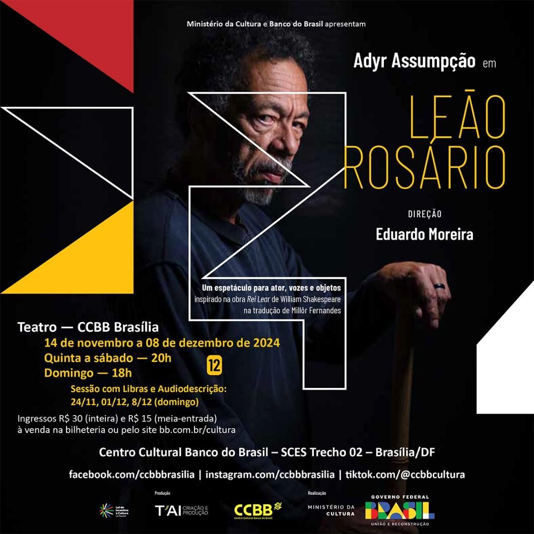 No mês da Consciência Negra, o Teatro do Centro Cultural Banco do Brasil Brasília recebe a peça Leão Rosário. Ambientado na costa Atlântica da África, o espetáculo solo, estrelado por Adyr Assumpção, narra a história de um velho rei, que toma uma decisão de consequências imprevisíveis