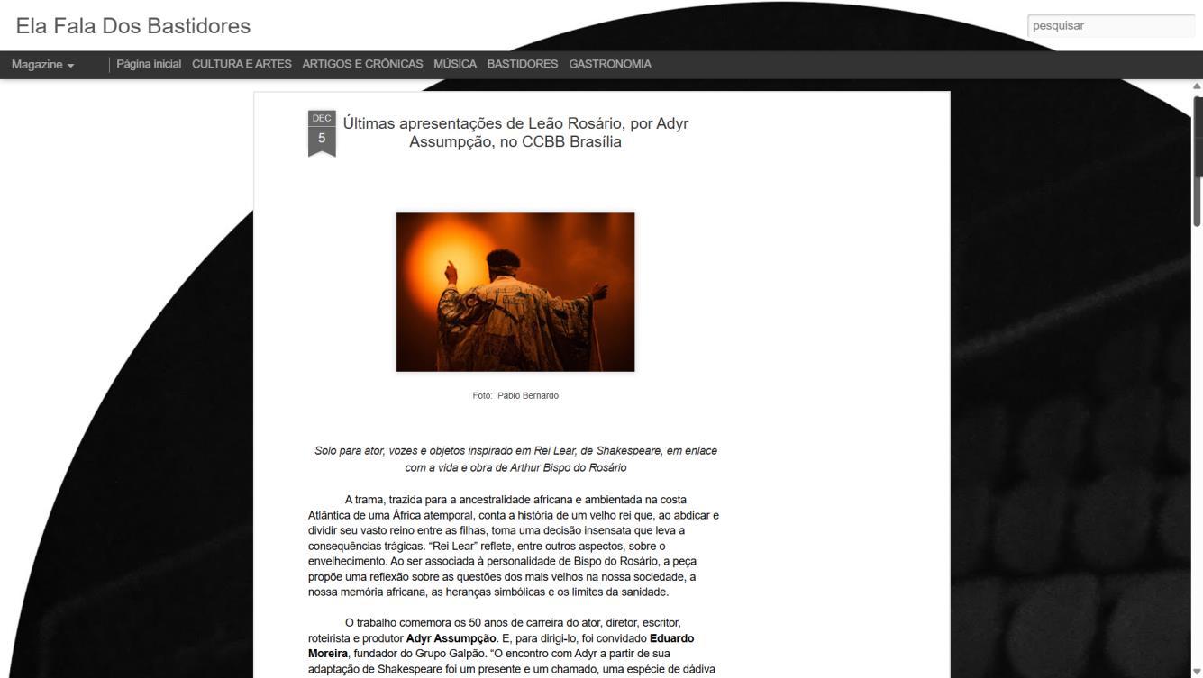 A peça é uma adaptação de Rei Lear de Shakespeare trazida para a ancestralidade africana com concepção, atuação e dramaturgia de Adyr Assumpção, que comemora 50 anos de carreira, e direção de Eduardo Moreira. Temporada de 14 de novembro a 8 de dezembro no CCBB Brasília