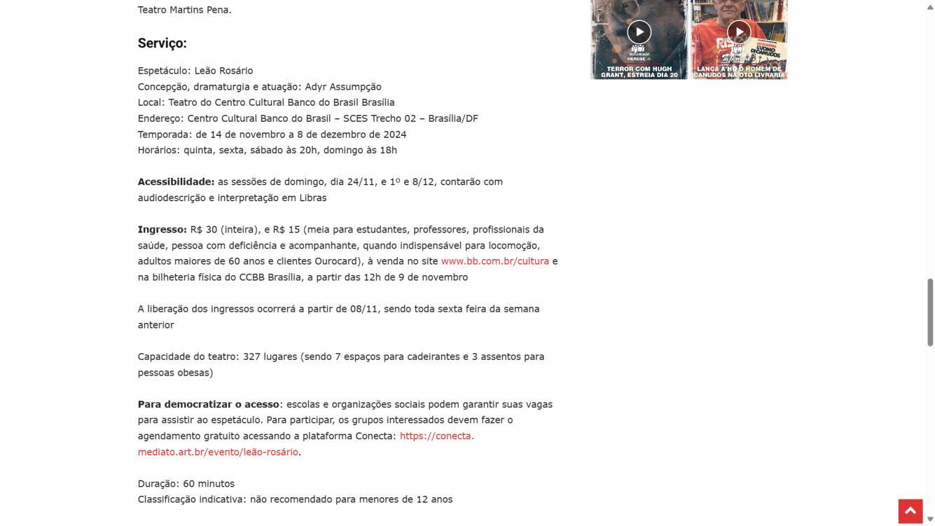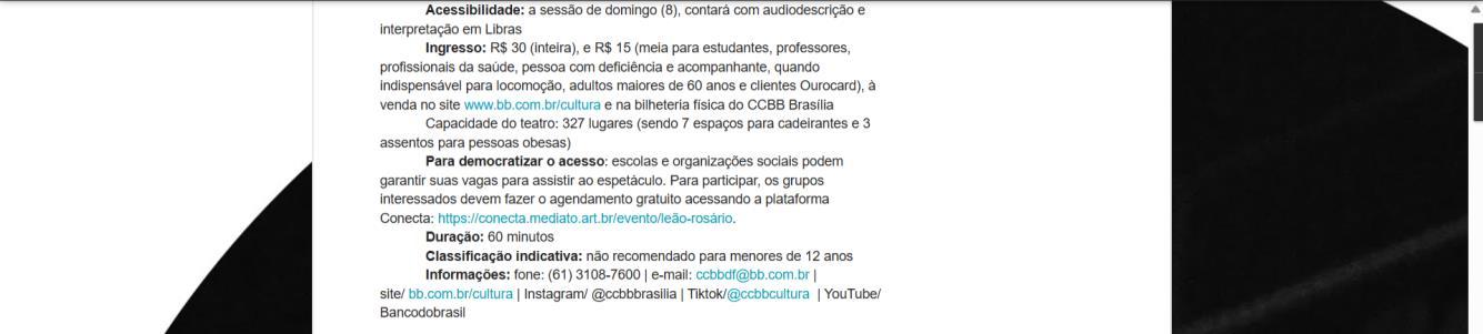 Para democratizar o acesso: escolas e organizações sociais podem garantir suas vagas para assistir ao espetáculo. Para participar, os grupos interessados devem fazer o agendamento gratuito acessando a plataforma Conecta: https://conecta.mediato.art.br/evento/leão-rosário.