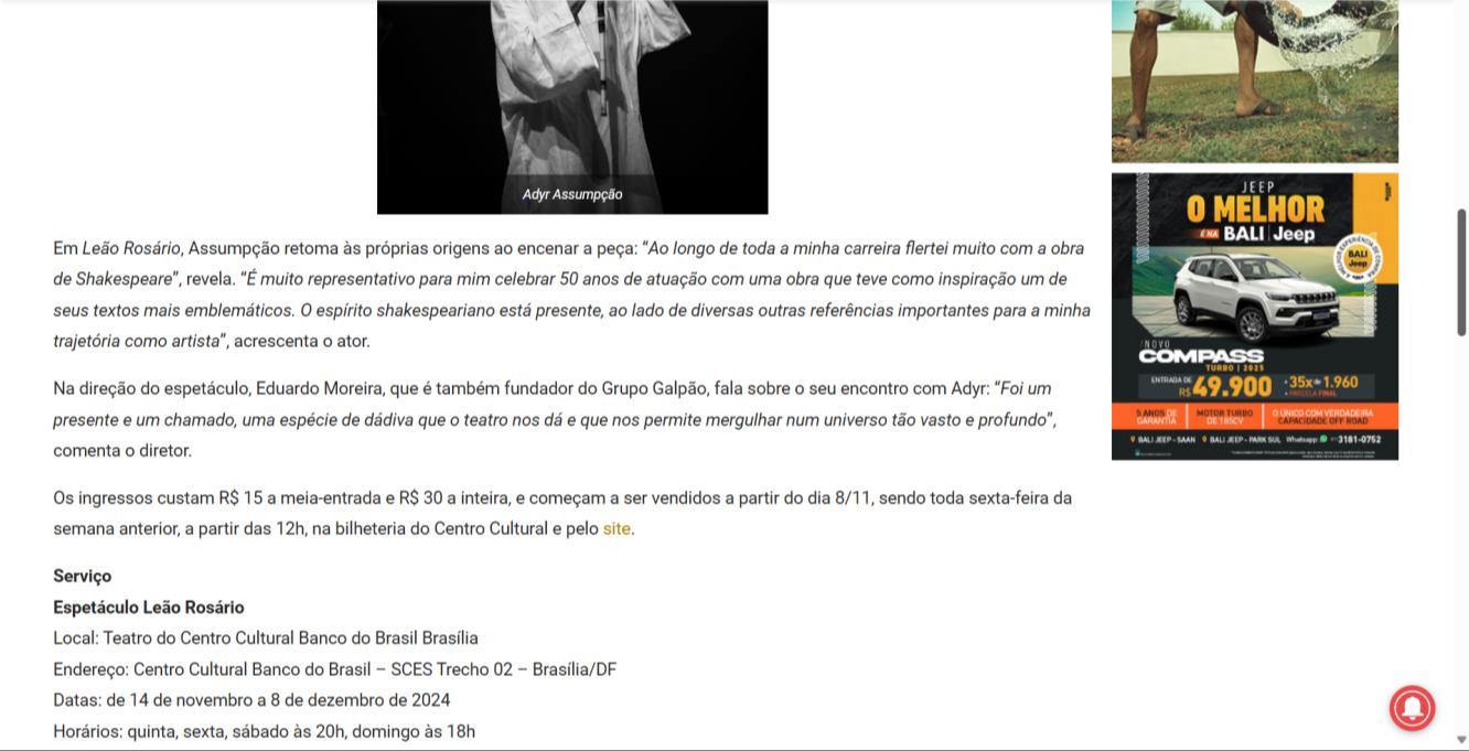 O trabalho comemora os 50 anos de carreira do ator, diretor, escritor, roteirista e produtor Adyr Assumpção. E, para dirigi-lo, foi convidado Eduardo Moreira, fundador do Grupo Galpão. “O encontro com Adyr a partir de sua adaptação de Shakespeare foi um presente e um chamado, uma espécie de dádiva que o teatro nos dá e que nos permite mergulhar num universo tão profundo”, comenta o diretor. A peça fica em temporada no CCBB Brasília até 8 de dezembro.