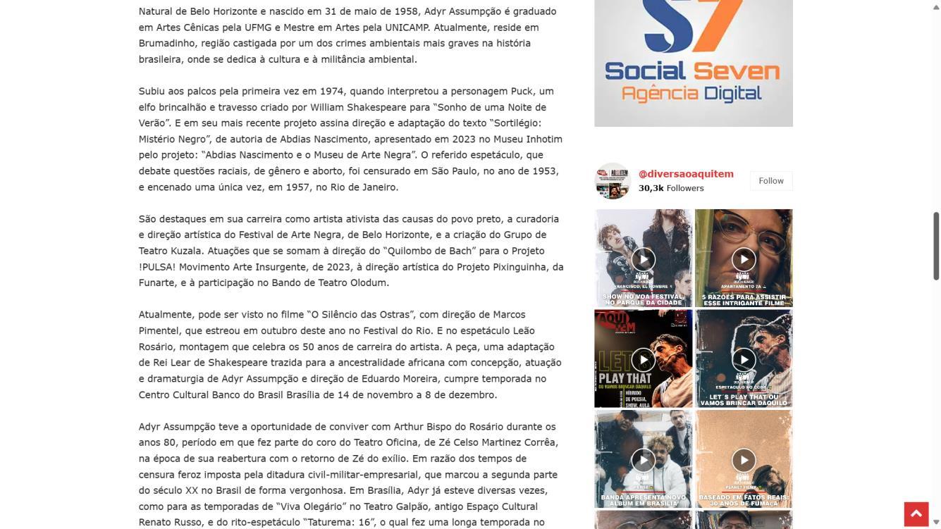 Atualmente, pode ser visto no filme “O Silêncio das Ostras”, com direção de Marcos Pimentel, que estreou em outubro deste ano no Festival do Rio. E no espetáculo Leão Rosário, montagem que celebra os 50 anos de carreira do artista. A peça, uma adaptação de Rei Lear de Shakespeare trazida para a ancestralidade africana com concepção, atuação e dramaturgia de Adyr Assumpção e direção de Eduardo Moreira, cumpre temporada no Centro Cultural Banco do Brasil Brasília de 14 de novembro a 8 de dezembro.