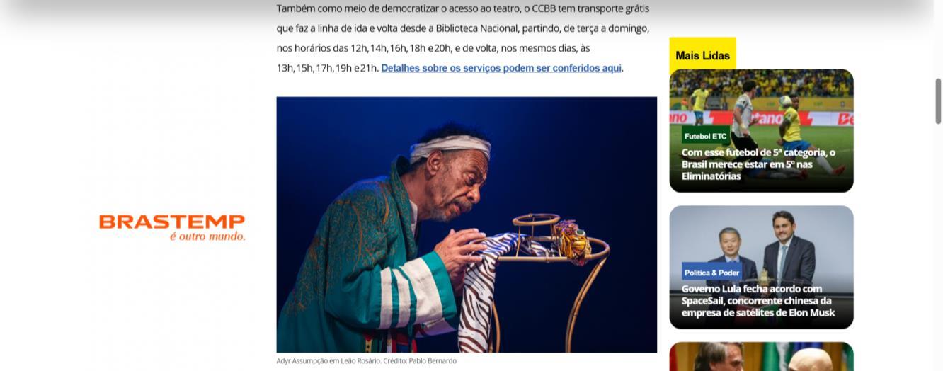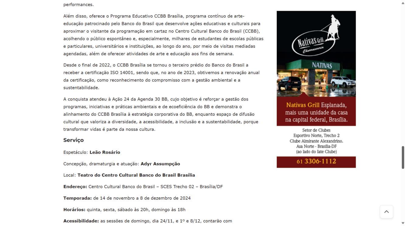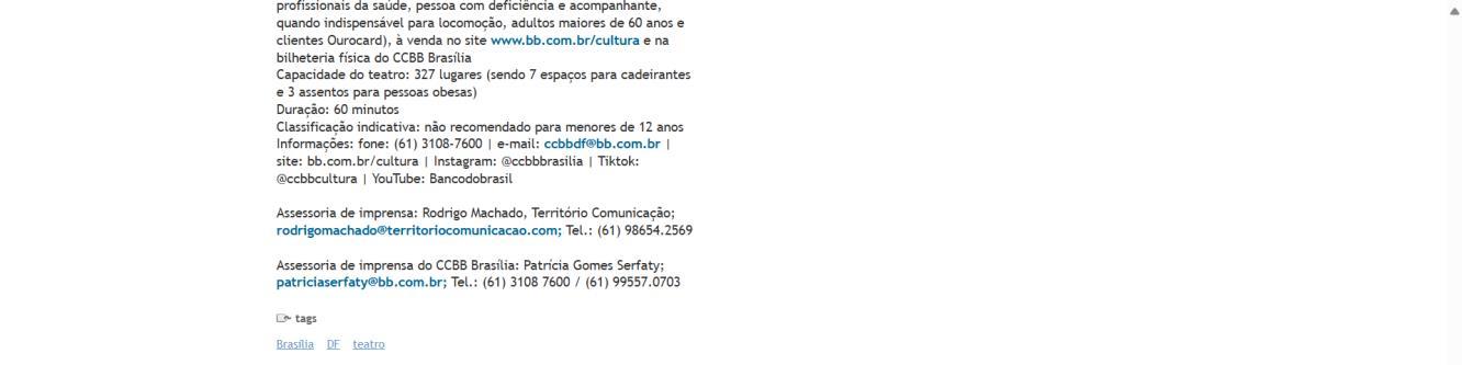 https://ccbb.com.br/brasilia/servicos/. O espetáculo conta com patrocínio do Banco do Brasil, por meio da Lei Federal Rouanet de Incentivo à Cultura.