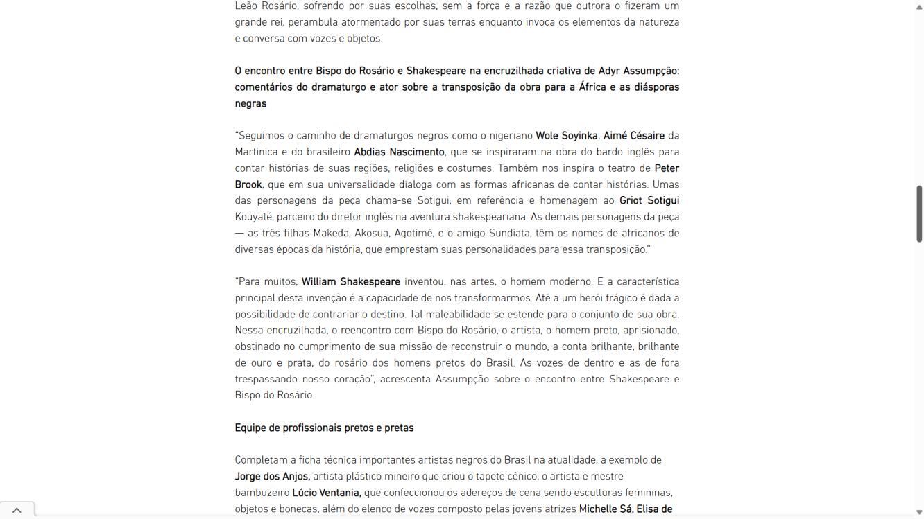 característica principal desta invenção é a capacidade de nos transformarmos. Até a um herói trágico é dada a possibilidade de contrariar o destino. Tal maleabilidade se estende para o conjunto de sua obra. Nessa encruzilhada, o reencontro com Bispo do Rosário, o artista, o homem preto, aprisionado, obstinado no cumprimento de sua missão de reconstruir o mundo, a conta brilhante, brilhante de ouro e prata, do rosário dos homens pretos do Brasil. As vozes de dentro e as de fora trespassando nosso coração”, acrescenta Assumpção sobre o encontro entre Shakespeare e Bispo do Rosário.