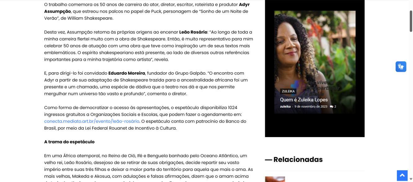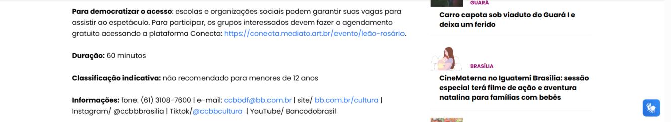 Para democratizar o acesso: escolas e organizações sociais podem garantir suas vagas para assistir ao espetáculo. Para participar, os grupos interessados devem fazer o agendamento gratuito acessando a plataforma Conecta: https://conecta.mediato.art.br/evento/leão-rosário