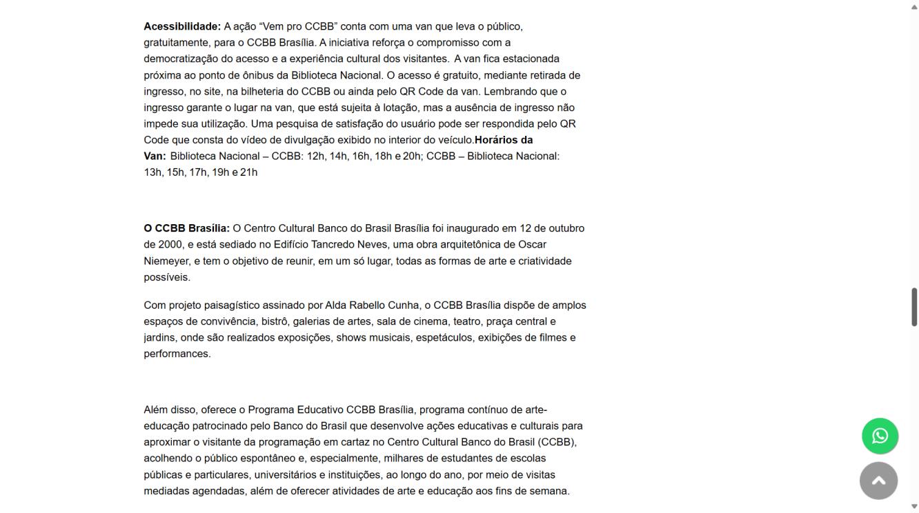 Acessibilidade: A ação “Vem pro CCBB” conta com uma van que leva o público, gratuitamente, para o CCBB Brasília. A iniciativa reforça o compromisso com a democratização do acesso e a experiência cultural dos visitantes. A van fica estacionada próxima ao ponto de ônibus da Biblioteca Nacional. O acesso é gratuito, mediante retirada de ingresso, no site, na bilheteria do CCBB ou ainda pelo QR Code da van. Lembrando que o ingresso garante o lugar na van, que está sujeita à lotação, mas a ausência de ingresso não impede sua utilização. Uma pesquisa de satisfação do usuário pode ser respondida pelo QR Code que consta do vídeo de divulgação exibido no interior do veículo.Horários da Van: Biblioteca Nacional – CCBB: 12h, 14h, 16h, 18h e 20h; CCBB – Biblioteca Nacional: 13h, 15h, 17h, 19h e 21h