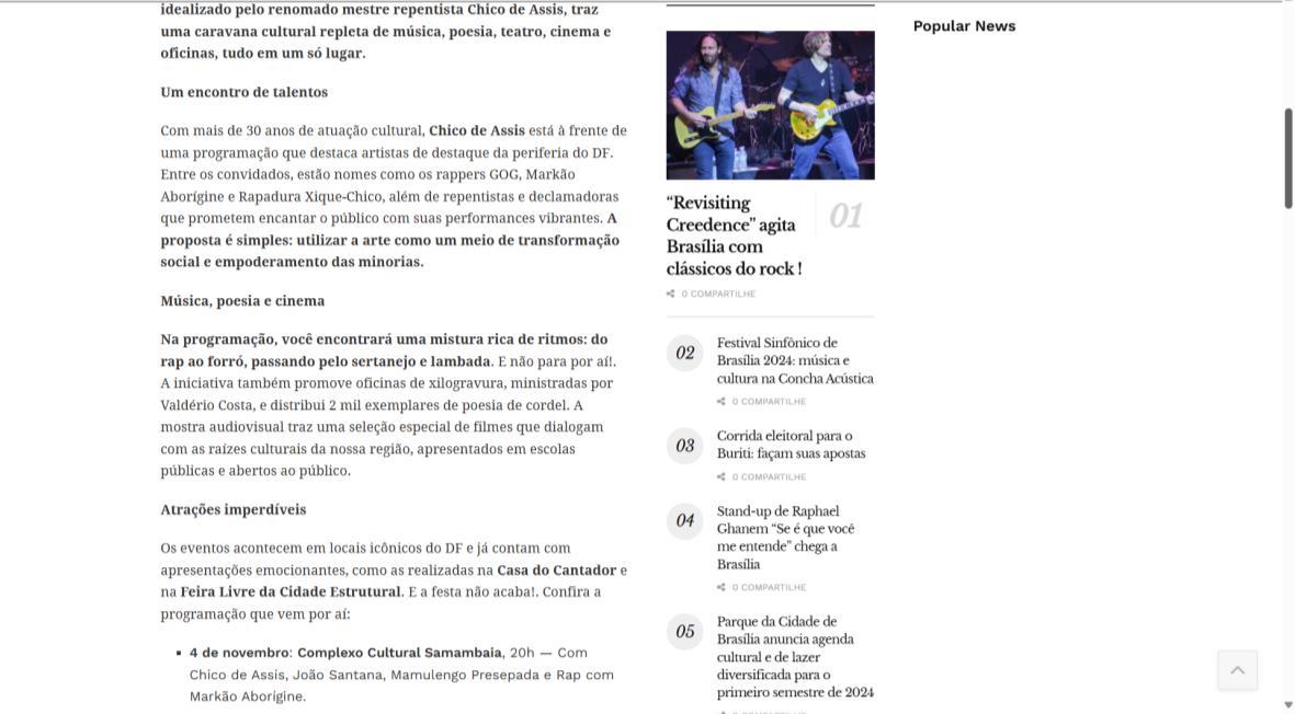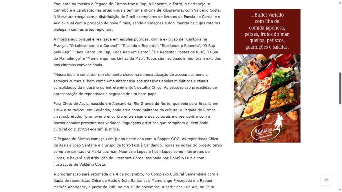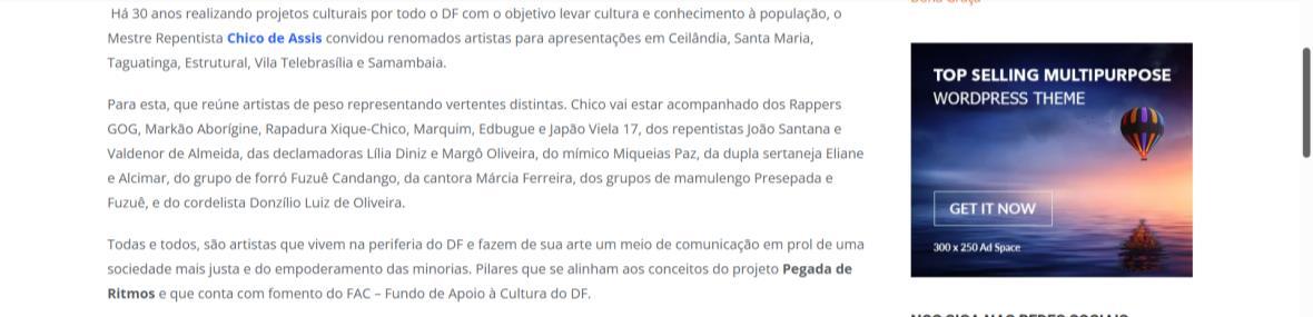 Há 30 anos realizando projetos culturais por todo o DF com principal objetivo levar cultura e conhecimento à população cujo acesso às artes é restrito O reverenciado Mestre Repentista Chico de Assis convidou um elenco de renomados artistas para 12 apresentações em Ceilândia, Santa Maria, Taguatinga, Estrutural, Vila Telebrasília e Samambaia